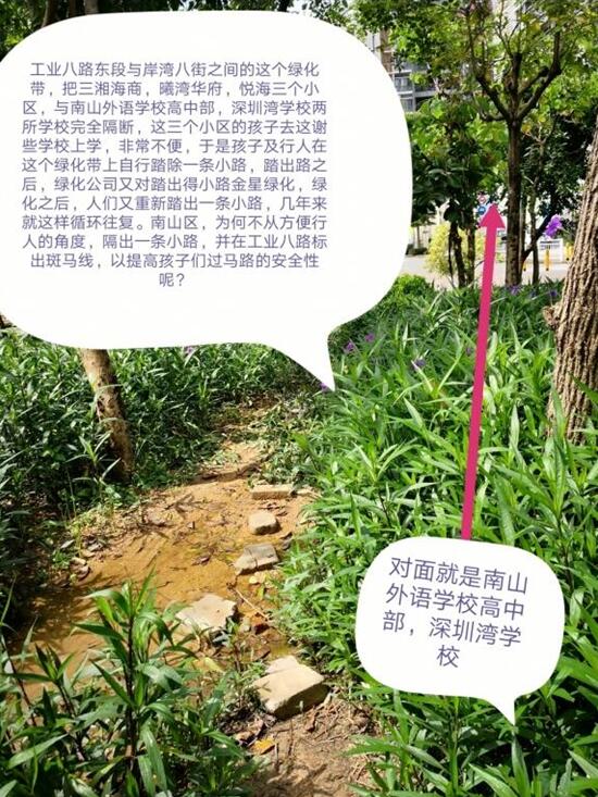 同時(shí),該市民還反映在工業(yè)八路東段與岸灣八街之間存在三個(gè)小區(qū)和兩個(gè)學(xué)校,周邊居民和孩子為了圖方便,在綠化帶上自行踏出了一條小路,綠化公司有對(duì)小路進(jìn)行綠化處理,但是處理過后,居民和孩子又會(huì)重新踏出一條,幾年來就這樣循環(huán)往復(fù)。并呼吁相關(guān)部門在此綠化帶修一條小路,在工業(yè)八路標(biāo)出斑馬線,提高孩子過馬路的安全性。