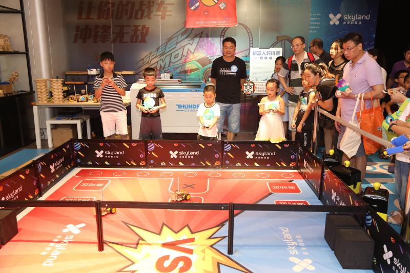 “我跟你說(shuō)噢,那邊吹出來(lái)的泡泡能把我們倆都包進(jìn)去!”“老媽,原來(lái)空氣的形狀是圓環(huán)形的呀……”歡聲笑語(yǔ)中,十幾項(xiàng)科技趣味項(xiàng)目讓小朋友們眼花繚亂、目不暇接,這其中,機(jī)器人對(duì)抗賽無(wú)疑是人氣最高的。賽場(chǎng)上,小朋友們分為紅藍(lán)兩隊(duì),手持遙控器在兩側(cè)站好。“小朋友們注意啦,每一位機(jī)器人身上有一個(gè)藍(lán)色燈柱,碰撞擋板被撞到后,燈柱長(zhǎng)度會(huì)縮短……”老師一邊在“戰(zhàn)場(chǎng)”中擺放機(jī)器人,一邊為孩子們?cè)敿?xì)講解規(guī)則。一聲哨響,紅藍(lán)兩隊(duì)的“機(jī)器人大戰(zhàn)”拉開(kāi)了帷幕,孩子們操控著自己的戰(zhàn)車(chē),左右閃躲,時(shí)而用一個(gè)漂亮的側(cè)移甩掉追擊者,時(shí)而全力沖擊消耗對(duì)方的“藍(lán)條”。賽場(chǎng)邊的家長(zhǎng)們似乎比小選手更為緊張,他們時(shí)不時(shí)俯下身子,為孩子們出謀劃策:“小超你看,邊上那個(gè)三號(hào)車(chē)藍(lán)條快沒(méi)了,快趕過(guò)去補(bǔ)一下!”一位父親看到了打破僵局的好機(jī)會(huì),急忙提醒道,小朋友則心領(lǐng)神會(huì),熟練的操縱著機(jī)器人貼了上去……經(jīng)過(guò)一番努力,在成功拿下這寶貴的一分后,小朋友回頭與自己的老爸相視一笑,父子二人之間的默契,在這一刻體現(xiàn)的淋漓盡致。