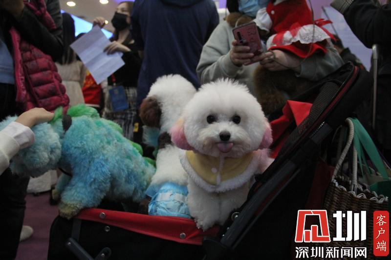 一位觀眾用小推車帶著自己家造型各異的三只寵物犬一起逛展。