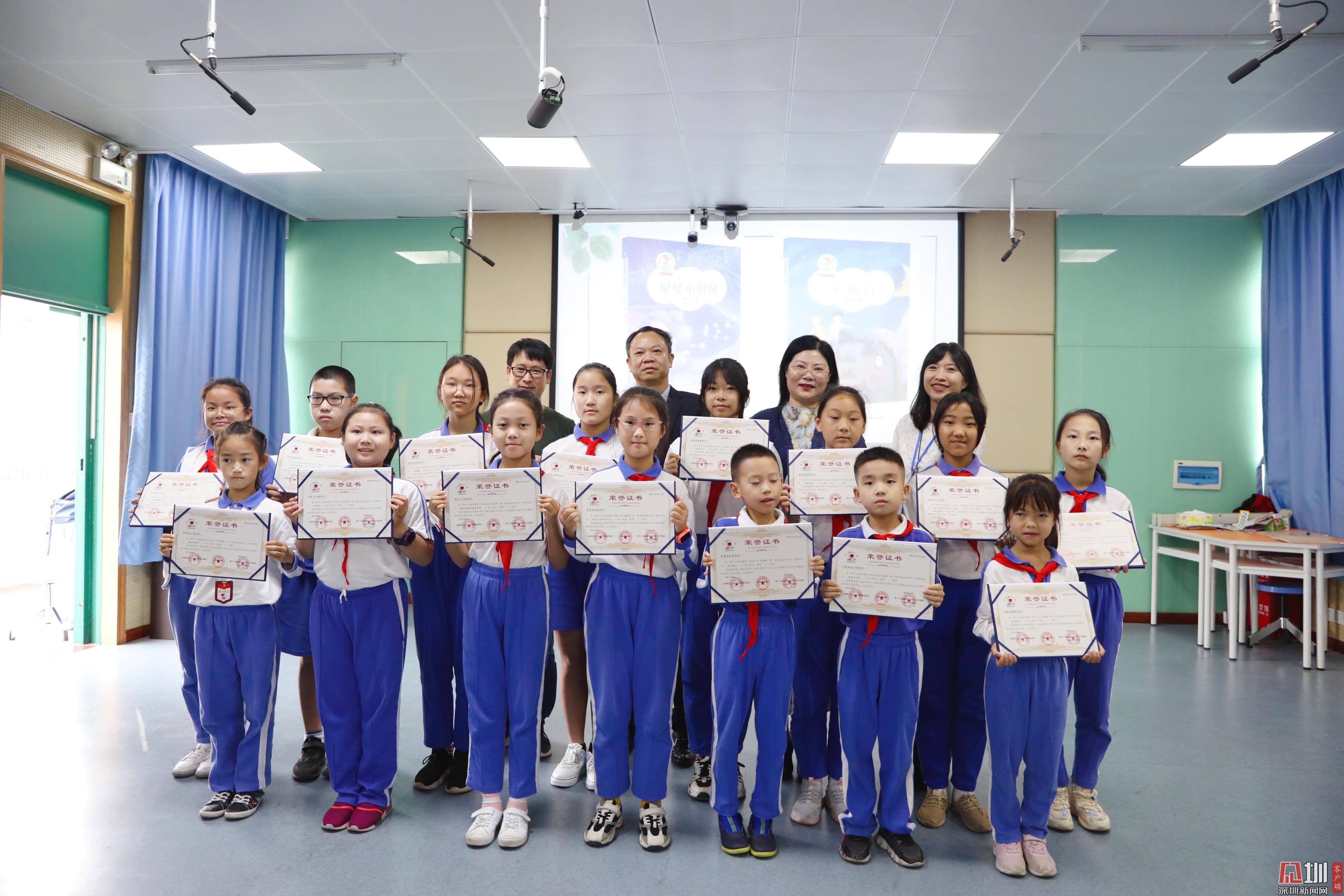為白芒小學(xué)入選深圳市復(fù)評(píng)的孩子頒獎(jiǎng)并合影