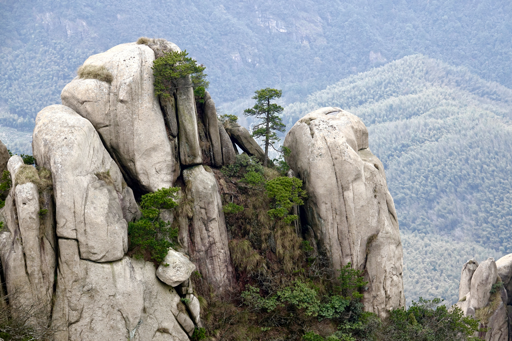 由于其隆起幅度自核心部位向周圍逐漸減小,外圍山地由硬度較花崗巖小的花崗閃長(zhǎng)巖和沉積巖組成,易被沖刷蝕低,故整個(gè)九華山體由眾多千姿百態(tài)、高低參差的中山、低山、丘陵和山間盆地等組成。李仁奇 攝