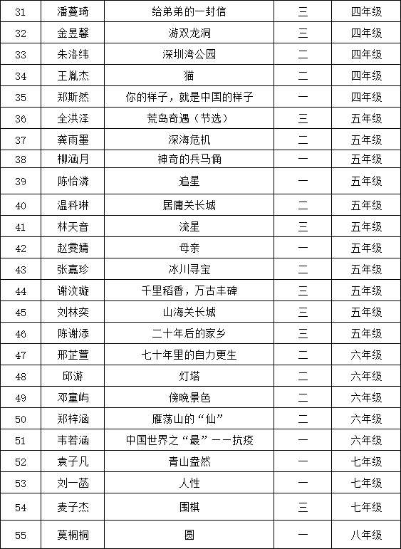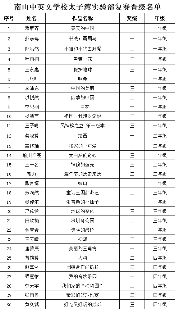 自2021年1月,活動(dòng)征稿啟動(dòng)以來,獲得了深圳市廣大中小學(xué)生、教師、文學(xué)愛好者的熱烈響應(yīng)積極參與,吸引了深圳百余所學(xué)校的上萬(wàn)人關(guān)注報(bào)名?,F(xiàn)公布南山中英文學(xué)校太子灣實(shí)驗(yàn)部晉級(jí)復(fù)賽名單如下: