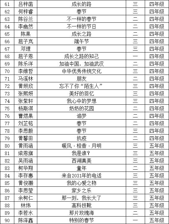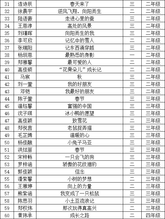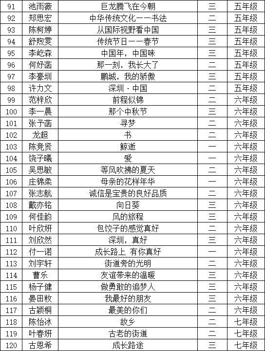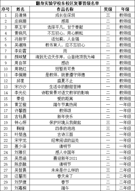 自2021年1月,活動征稿啟動以來,獲得了深圳市廣大中小學生、教師、文學愛好者的熱烈響應積極參與,吸引了深圳百余所學校的上萬人關(guān)注報名?,F(xiàn)公布寶安區(qū)翻身實驗學校(東校區(qū))晉級復賽名單如下: