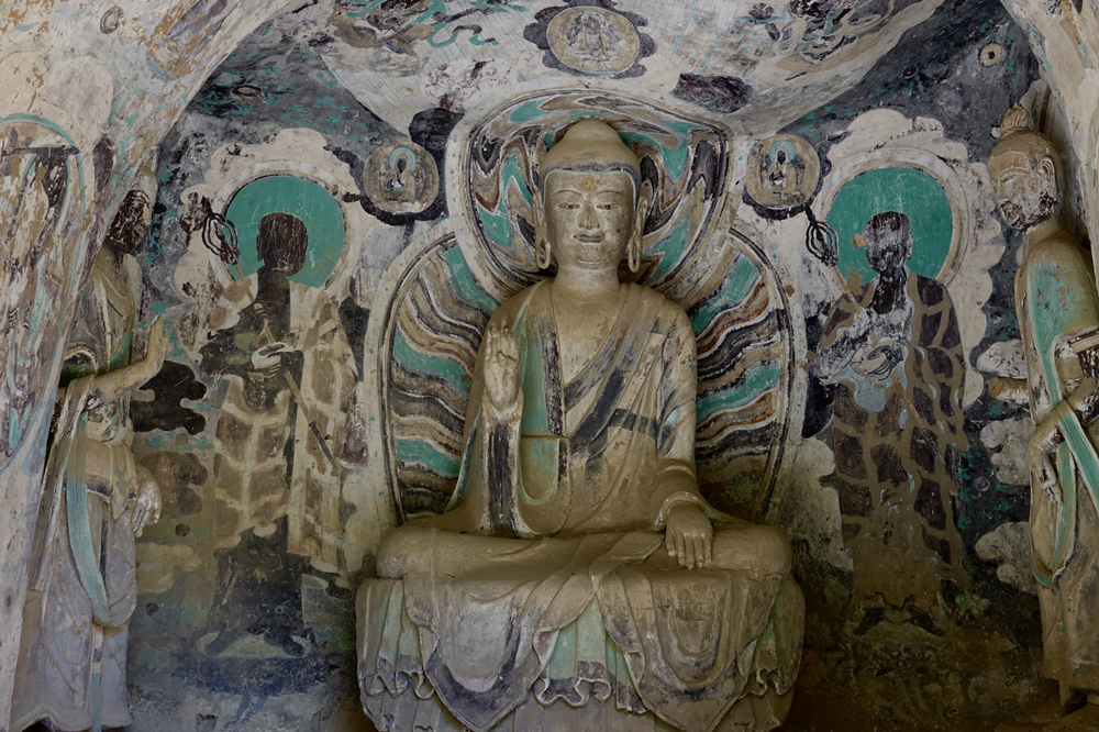 82窟,一結(jié)跏趺坐佛二脅侍菩薩,佛左右壁畫(huà)二弟子??唔敽烷T(mén)道露出底層,為北周原作,表層壁畫(huà)為明代重繪。李仁奇 攝