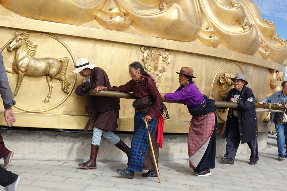 按照藏傳佛教的說法,大轉(zhuǎn)經(jīng)筒上面刻的經(jīng)咒和里面裝的經(jīng)咒比小轉(zhuǎn)經(jīng)筒要多,轉(zhuǎn)一圈劃過的軌跡比小轉(zhuǎn)經(jīng)筒大得多,積累的功德也高得多。李仁奇 攝