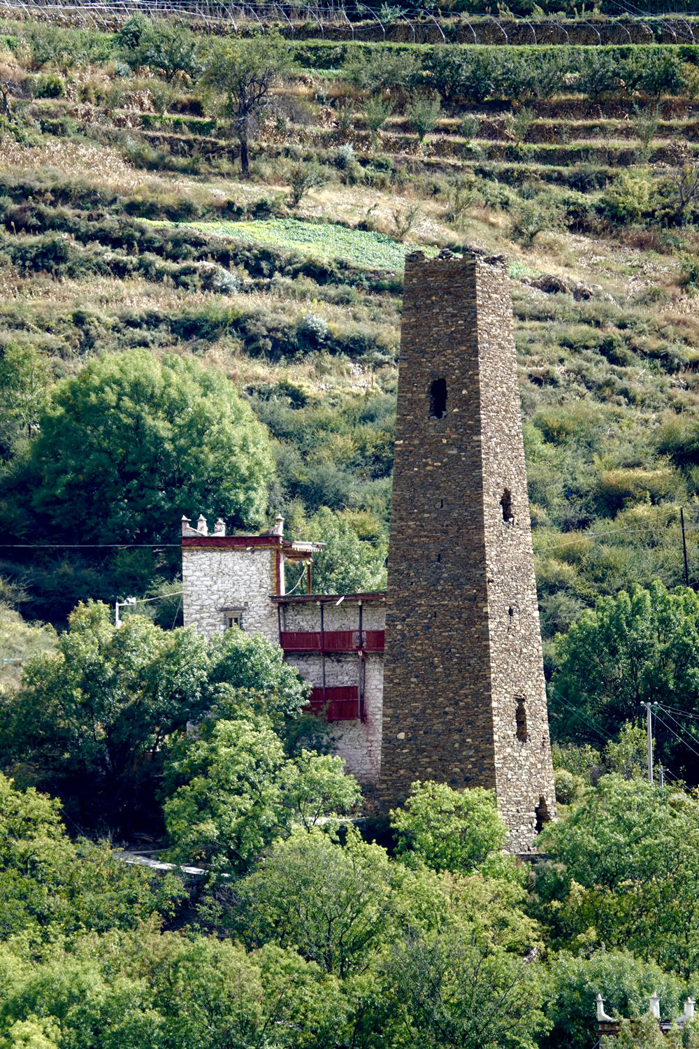 所有碉樓的樓門都開在一兩丈高的地方,門前放有獨(dú)木梯,一旦敵人來犯,只要退入碉樓,抽掉樓梯,關(guān)上樓門,極難進(jìn)入。況且樓內(nèi)設(shè)有箭眼,遠(yuǎn)則箭射,近則滾木巨石,易守難攻。李仁奇 攝