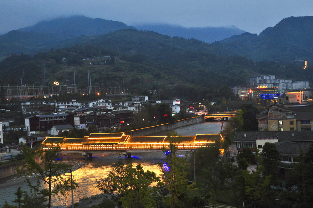 禪城橋是水磨古鎮(zhèn)災(zāi)后重建的一座步行橋,2009年9月開工,2010年1月竣工。主體采用預(yù)制小箱梁簡支梁橋,上部為木結(jié)構(gòu)長廊,造型獨(dú)特,韻味古典。李仁奇 攝