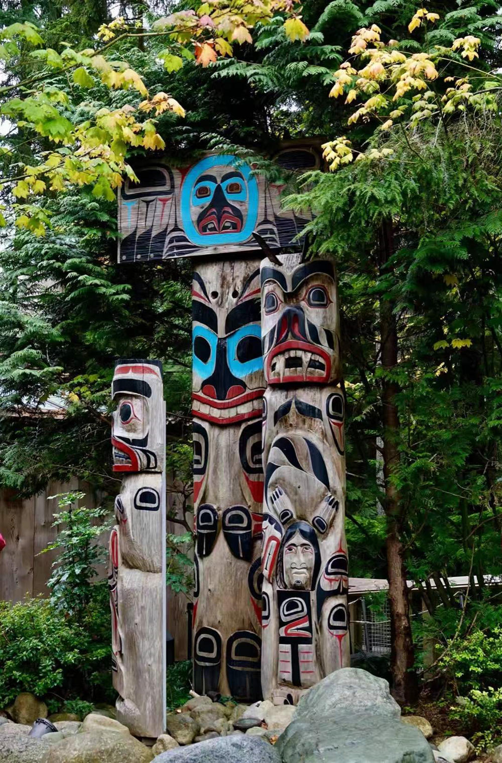 圖騰柱上面刻有帶著不同象征意義圖案,多數(shù)是鷹、熊、人之類(lèi)的圖騰疊加,每根圖騰柱代表不同的意義,透著一種古樸和粗獷的美。李仁奇 攝