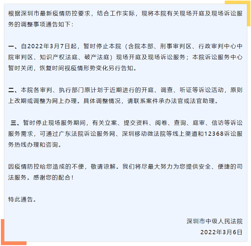 讀特客戶端·深圳新聞網(wǎng)2022年3月7日訊(記者 張玲)3月6日夜間,深圳市中級人民法院發(fā)布通告,從2022年3月7日開始暫?,F(xiàn)場開庭及現(xiàn)場訴訟服務,訴訟服務中心也暫時關閉,恢復時間另行告知。