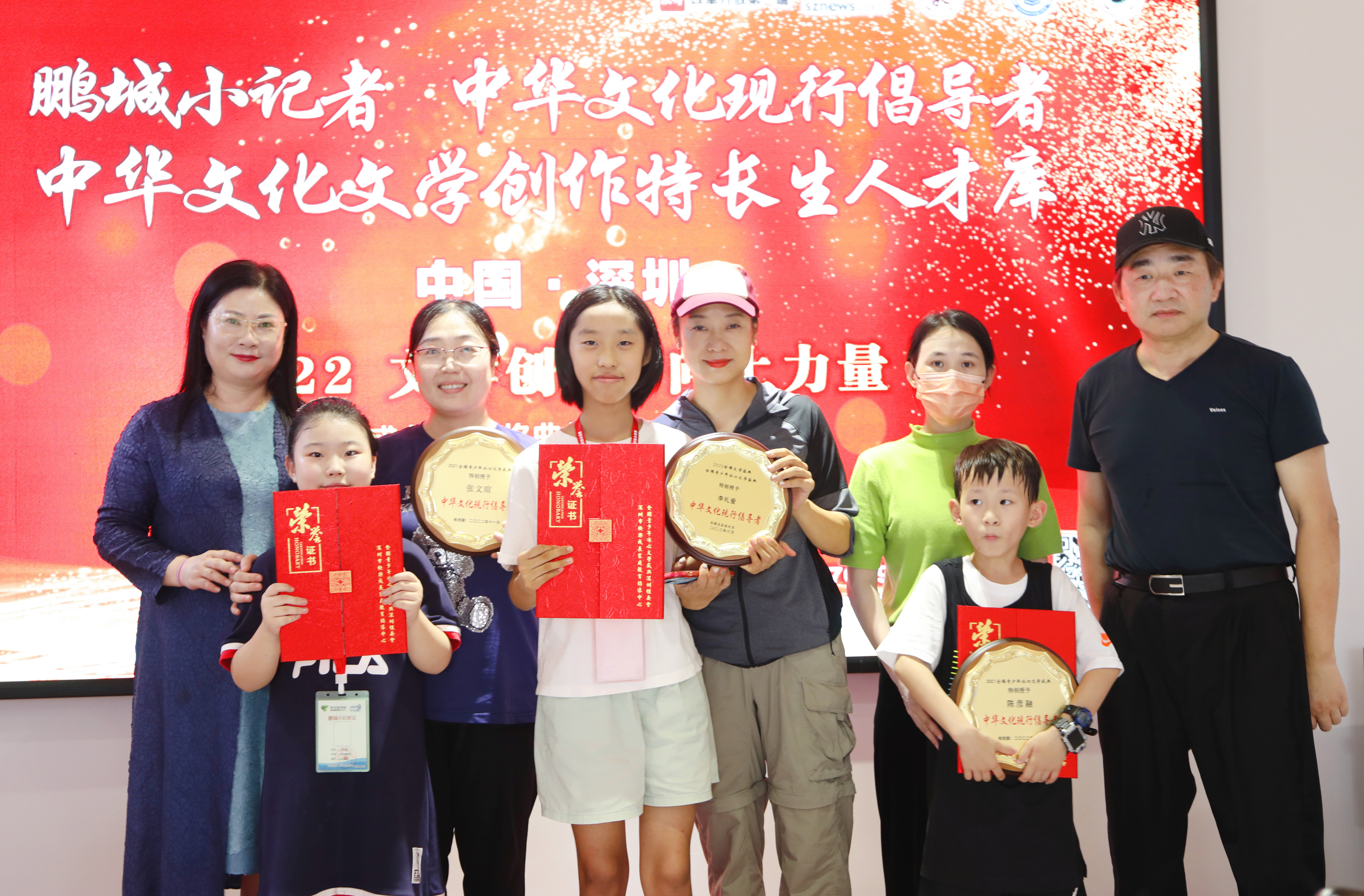 “中華文化現(xiàn)行倡導(dǎo)者”“中華文化文學(xué)特長生人才庫”和“鵬城小記者”的優(yōu)生代表們與家長、頒獎嘉賓合影留念