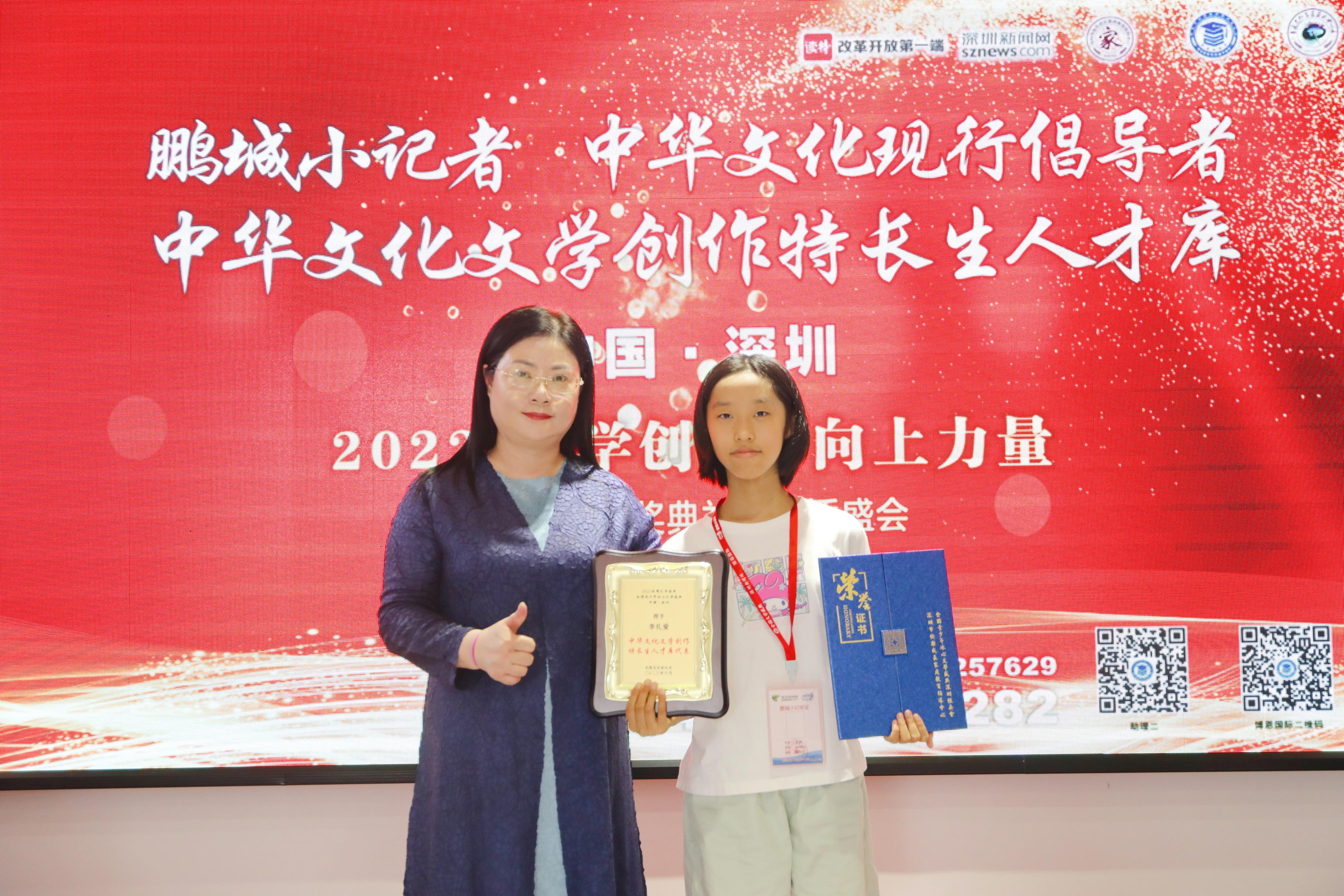 全國文學盛典聯合發(fā)起人、創(chuàng)始人肖硯寧與獲獎學生李禮愛合影