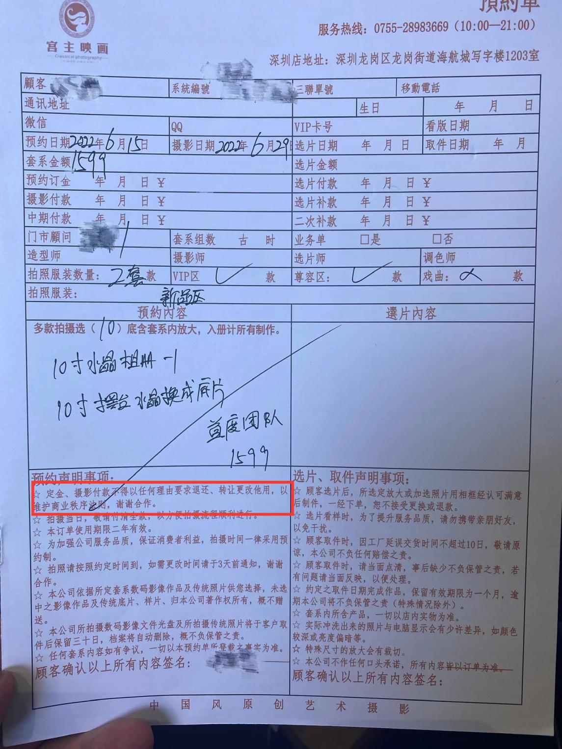 深圳市消委會接到消費者投訴后,立即聯(lián)系消費者及商家核實情況。商家表示協(xié)議已標明不可退還或更改他用,只同意消費者把拍攝服務自行轉讓出去。市消委會告知商家合同中的“不退不換”是典型的“霸王條款”,屬于無效格式條款,若消費者違約可以收取一定比例的違約金。后商家同意扣除30%違約金,退款1120元,但一直拖延,至今仍未退費。經查,商家注冊地址:深圳市龍崗區(qū)龍崗街道南聯(lián)社區(qū)龍崗大道(龍崗段)6001號海航國興花園南苑6AB棟B1207。
