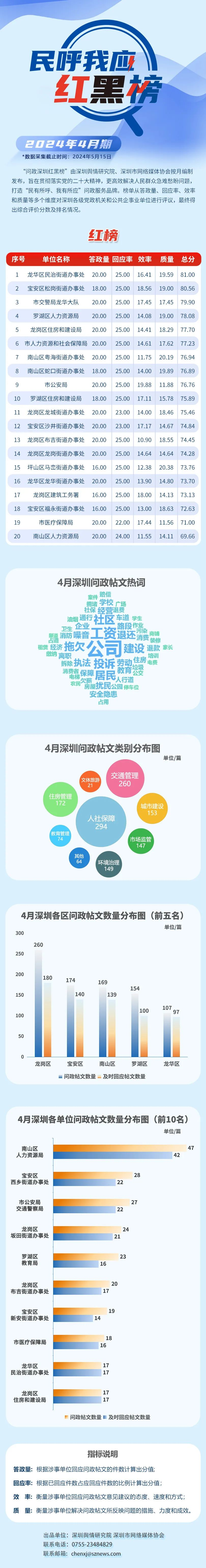 2024年4月,共有20家單位因積極解決民生問題,認真細致答政,最終登上“紅榜”,它們分別是:龍華區(qū)民治街道辦事處、寶安區(qū)松崗街道辦事處、市交警局龍華大隊、羅湖區(qū)人力資源局、龍崗區(qū)住房和建設(shè)局、市人力資源和社會保障局、南山區(qū)粵海街道辦事處、南山區(qū)蛇口街道辦事處、市公安局、羅湖區(qū)住房和建設(shè)局、龍崗區(qū)龍城街道辦事處、寶安區(qū)沙井街道辦事處、龍崗區(qū)布吉街道辦事處、龍崗區(qū)龍崗街道辦事處、坪山區(qū)馬巒街道辦事處、龍華區(qū)龍華街道辦事處、龍崗區(qū)建筑工務(wù)署、寶安區(qū)福永街道辦事處、市醫(yī)療保障局、南山區(qū)人力資源局。