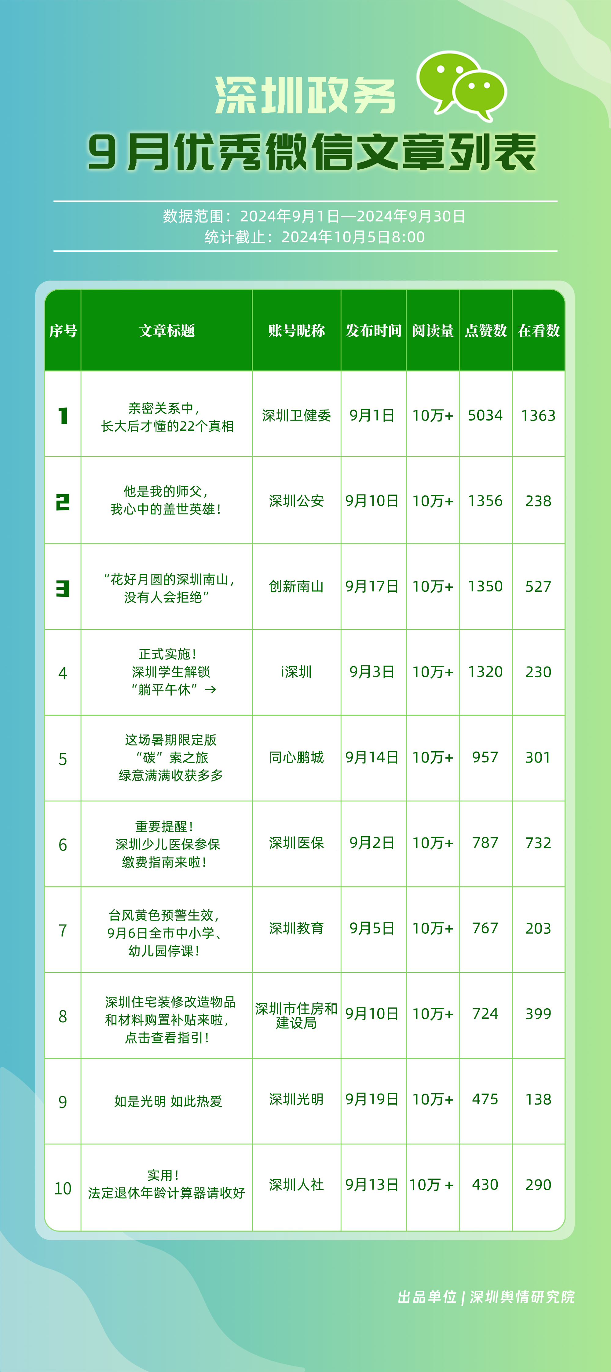 9月,“幸福福田”“深圳龍崗發(fā)布”“創(chuàng)新南山”“深圳龍華”“羅湖發(fā)布”“深圳光明”“青春深圳”“深圳衛(wèi)健委”“濱海寶安”和“深圳公安”共10個政務(wù)頭條號入選“優(yōu)秀政務(wù)頭條號”榜單。文章《剛剛!20多分鐘警報響徹深圳,不少人瞬間淚目……》涉及重大歷史節(jié)點,引發(fā)市民深刻共鳴,《耳朵總是癢癢癢,是怎么回事?》《強(qiáng)冷空氣即將抵達(dá)廣東!國慶出游天氣……》等深入民生領(lǐng)域、緊貼節(jié)假日需求,提供了健康知識科普和氣象信息,以高度實用價值獲得網(wǎng)民點贊。