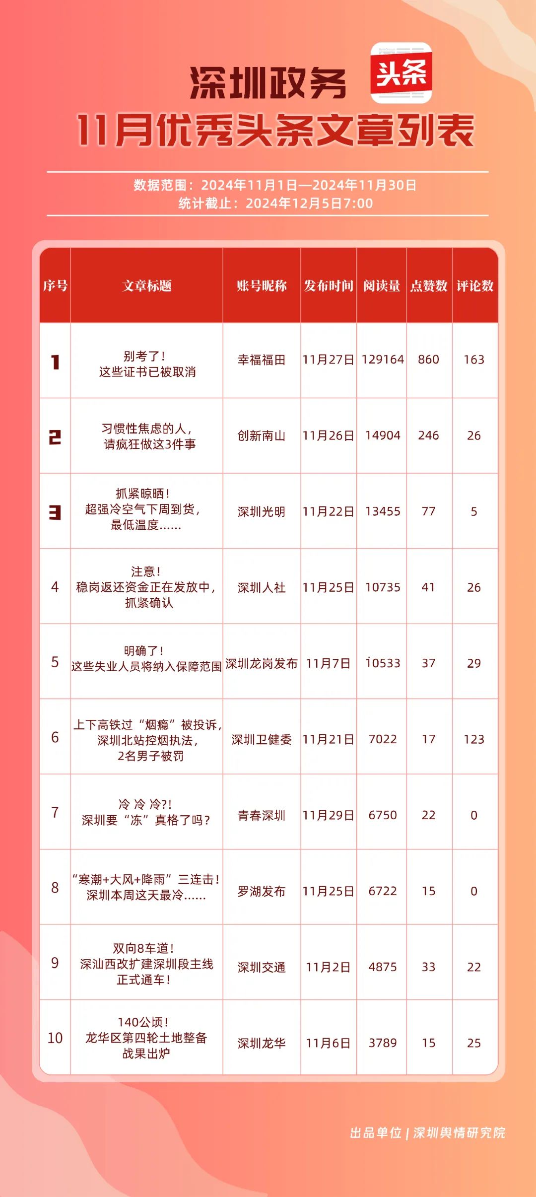 11月,“幸福福田”“深圳龍崗發(fā)布”“創(chuàng)新南山”“深圳人社”“深圳龍華”“深圳光明”“濱海寶安”“坪山發(fā)布”“深圳衛(wèi)健委”“羅湖發(fā)布”共10個政務(wù)頭條號入選“優(yōu)秀政務(wù)頭條號”榜單?!靶腋8L铩卑l(fā)布大量民生相關(guān)信息,穩(wěn)居第一。“深圳龍崗發(fā)布”同樣表現(xiàn)不凡,排名始終位于前列,展現(xiàn)了其在信息傳播與政務(wù)服務(wù)方面的卓越能力。此外,賬號“創(chuàng)新南山”“深圳人社”“深圳龍華”“深圳光明”在榜單中的排名有所提升,為政務(wù)新媒體樹立了典范。