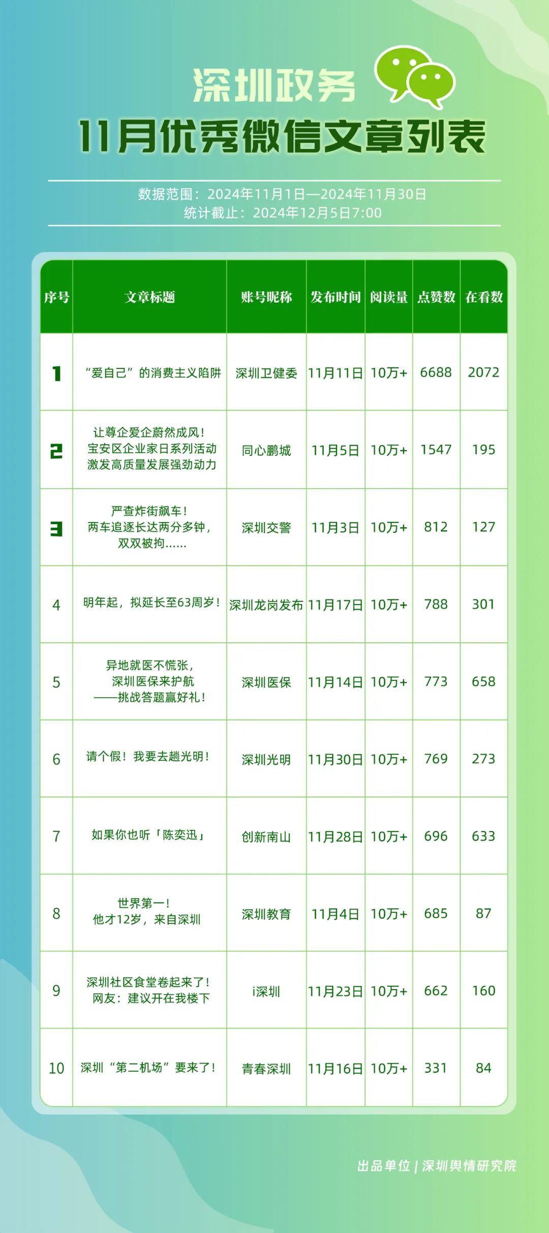 11月,“深圳衛(wèi)健委”“深圳龍崗發(fā)布”“幸福福田”“i深圳”“創(chuàng)新南山”“青春深圳”“深圳光明”“深圳工會”“深圳教育”“深圳龍華”等30個賬號入選“深圳優(yōu)秀政務(wù)微信公眾號”。其中,“深圳衛(wèi)健委”以802.2分位于榜單首位,“深圳龍崗發(fā)布”“幸福福田”“i深圳”排名保持靠前?!皠?chuàng)新南山”“深圳光明”則憑借內(nèi)容質(zhì)量、創(chuàng)新性的提升,展現(xiàn)了政務(wù)宣傳的新活力,排名有所提升。