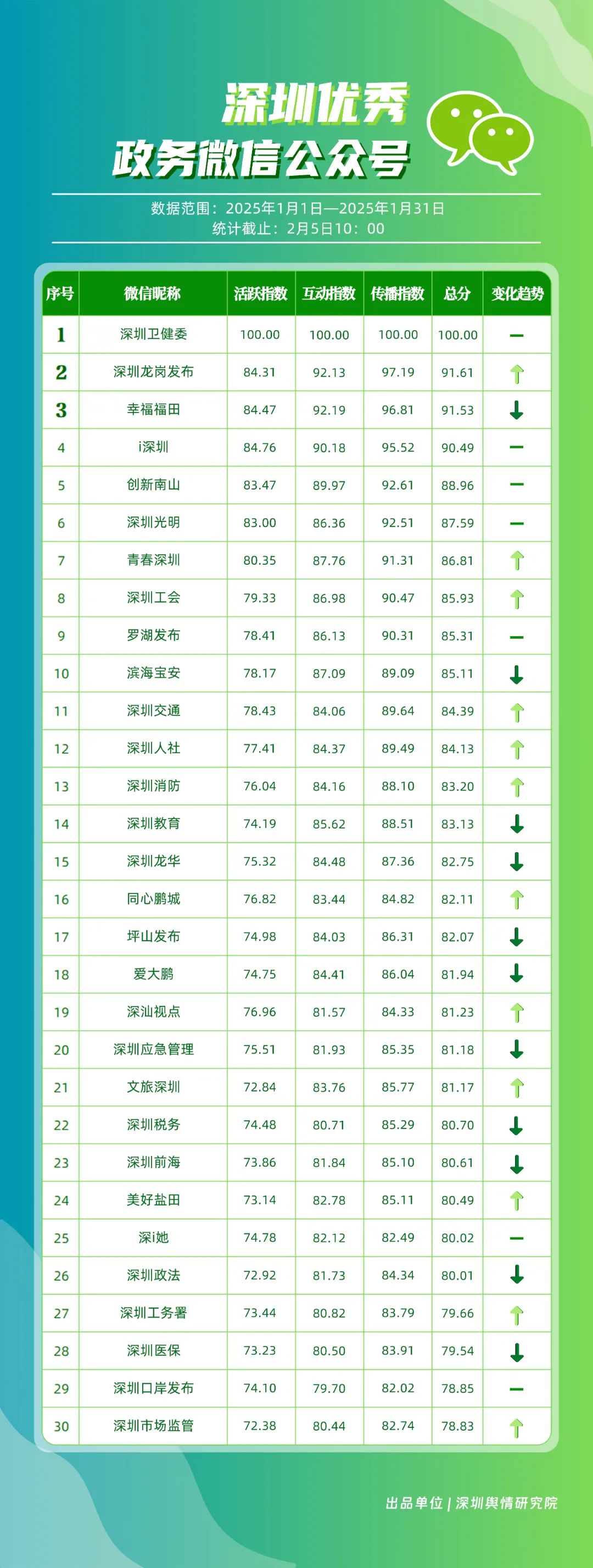 1月,“深圳衛(wèi)健委”“深圳龍崗發(fā)布”“幸福福田”“i深圳”“創(chuàng)新南山”“深圳光明”“青春深圳”“深圳工會(huì)”“羅湖發(fā)布”“濱海寶安”等30個(gè)賬號(hào)入選“深圳優(yōu)秀政務(wù)微信公眾號(hào)”。其中,“深圳衛(wèi)健委”各方面表現(xiàn)卓越,位于榜單首位,獲得總分100分?!吧钲邶垗彴l(fā)布”“青春深圳”“深圳工會(huì)”排名在本期有所提升,反映了這些賬號(hào)在內(nèi)容創(chuàng)新與受眾互動(dòng)方面的不懈努力?!癷深圳”“創(chuàng)新南山”“深圳光明”“羅湖發(fā)布”則保持了穩(wěn)健的排名,持續(xù)在政務(wù)信息的傳播中扮演著不可或缺的角色。