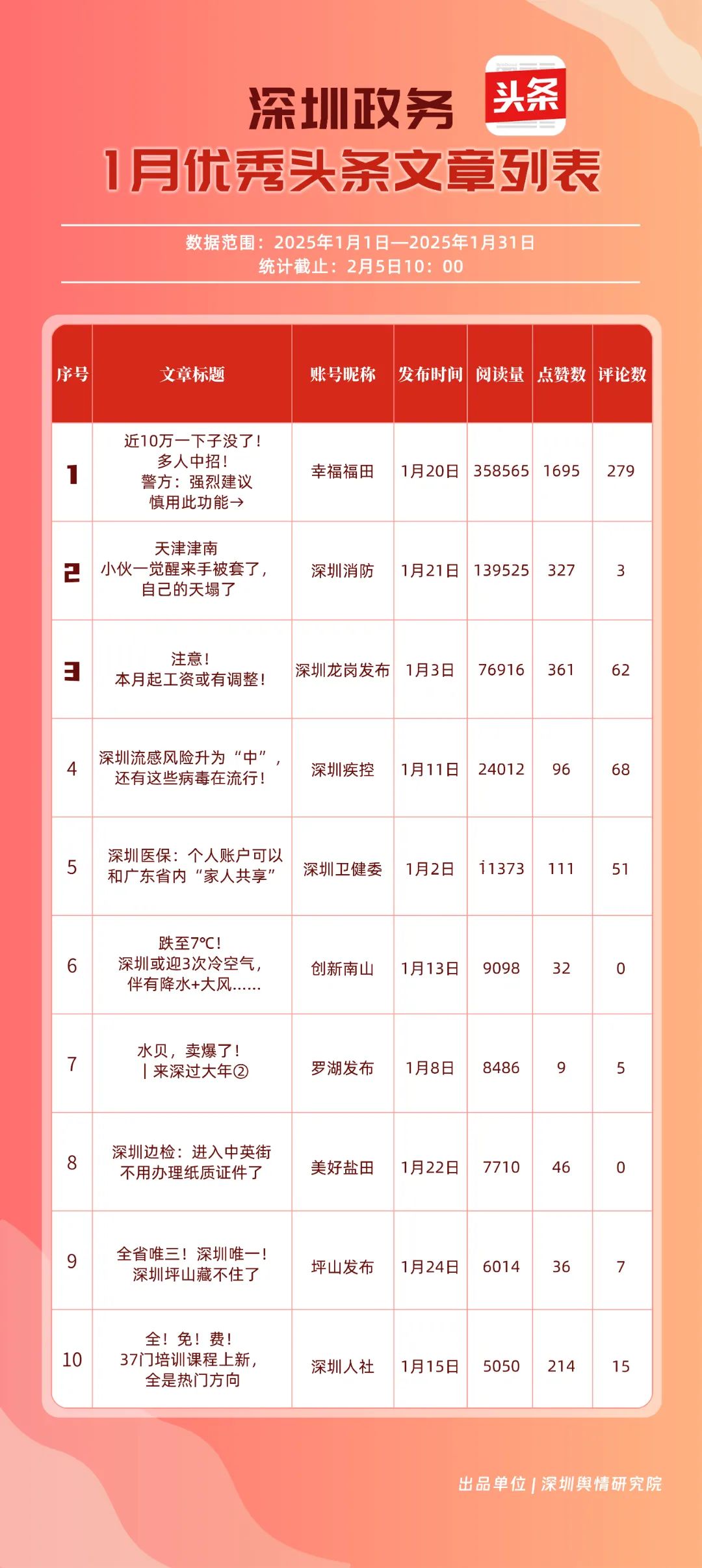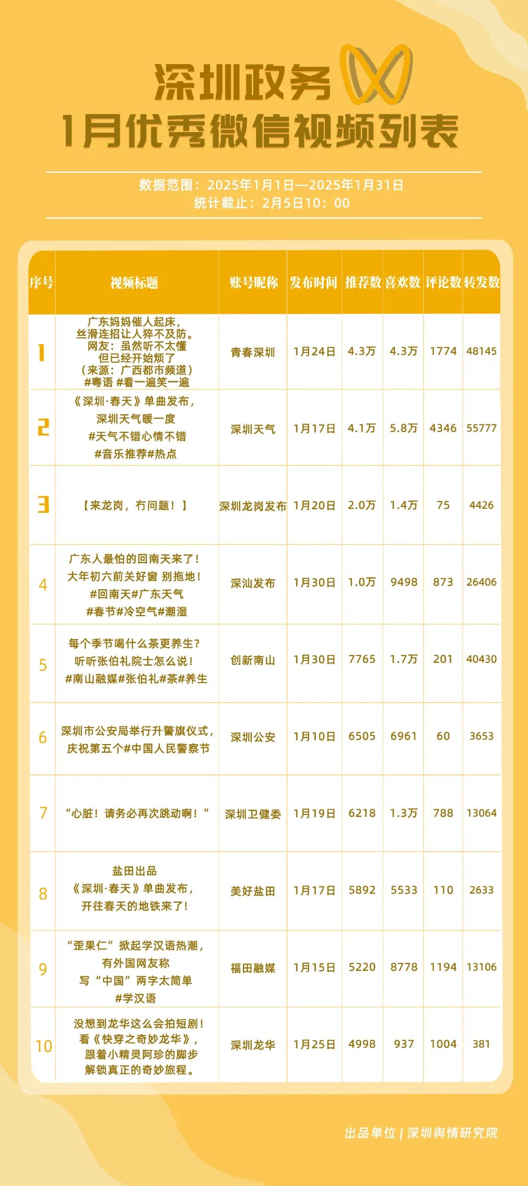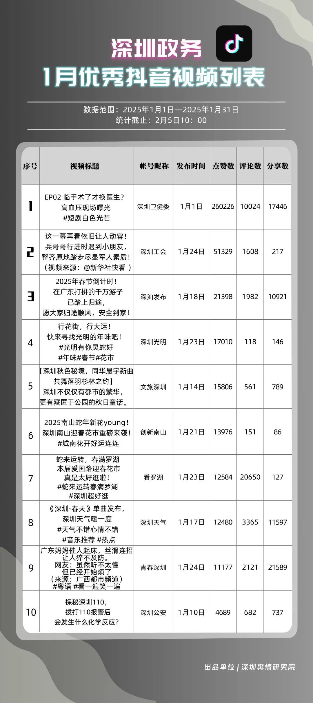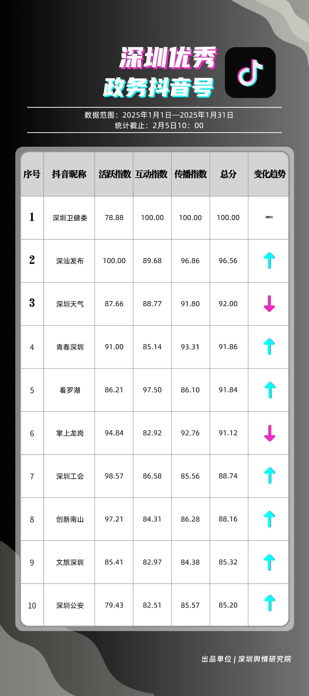 1月,“深圳衛(wèi)健委”“深汕發(fā)布”“深圳天氣”“青春深圳”“看羅湖”“掌上龍崗”“深圳工會(huì)”“創(chuàng)新南山”“文旅深圳”“深圳公安”共10個(gè)政務(wù)抖音號(hào)獲得“深圳優(yōu)秀政務(wù)抖音號(hào)”稱號(hào)?!吧钲谛l(wèi)健委”“深汕發(fā)布”“深圳天氣”成績(jī)優(yōu)異,綜合實(shí)力較強(qiáng),位于榜單前列?!扒啻荷钲凇薄翱戳_湖”等賬號(hào)排名有所提升,彰顯了這些賬號(hào)在拓寬受眾基礎(chǔ)、增強(qiáng)用戶黏性等方面所取得的積極成效。
