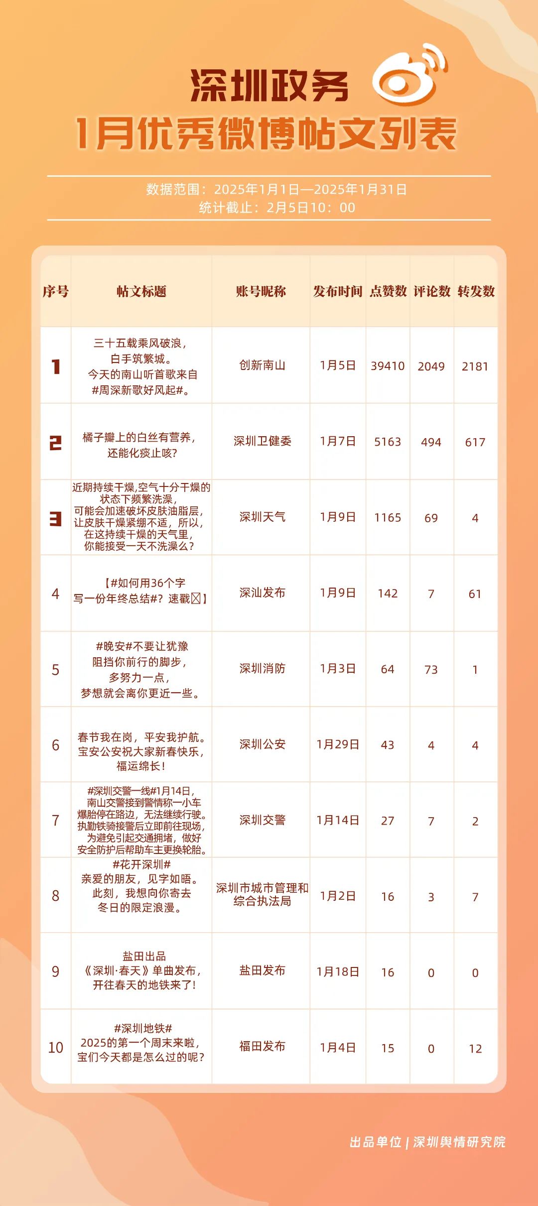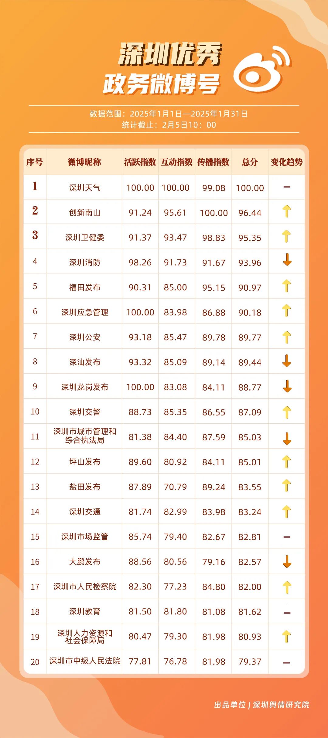 1月,“深圳天氣”“創(chuàng)新南山”“深圳衛(wèi)健委”“深圳消防”“福田發(fā)布”“深圳應(yīng)急管理”“深圳公安”“深汕發(fā)布”“深圳龍崗發(fā)布”“深圳交警”等20個(gè)賬號(hào)入選“優(yōu)秀政務(wù)微博號(hào)”。“深圳天氣”憑借高活躍度、互動(dòng)量等獲得滿分,“創(chuàng)新南山”“深圳衛(wèi)健委”賬號(hào)則在1月發(fā)力宣傳,排名上升至榜單第二、三位。同時(shí),“深圳消防”“福田發(fā)布”“深圳應(yīng)急管理”賬號(hào)總分在90分以上,彰顯了他們?cè)谔嵘姲踩庾R(shí)、促進(jìn)政民互動(dòng)等方面所做出的積極貢獻(xiàn)。