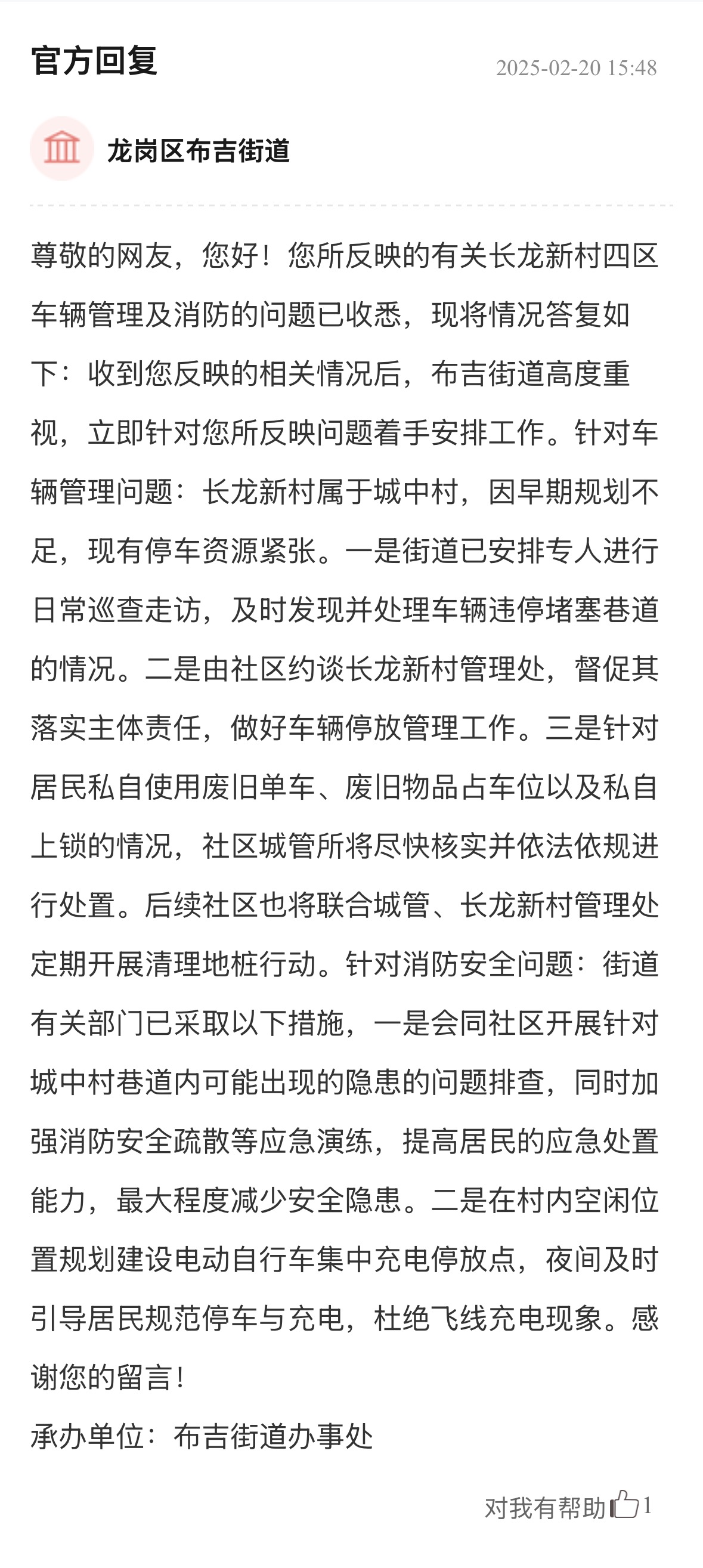 案例點評:街道辦針對車輛管理、消防問題多管齊下,旨在營造一個通暢、安全的出行和生活環(huán)境,態(tài)度值得肯定?;貞?yīng)展示了街道辦構(gòu)建的“專項巡查+設(shè)施建設(shè)+行為引導(dǎo)”綜合治理體系,精準(zhǔn)直擊問題核心,兼顧當(dāng)下整治與長遠規(guī)劃,切實保障居民居住和生活安全,其系統(tǒng)性解決思路對同類區(qū)域治理具有重要參考價值。