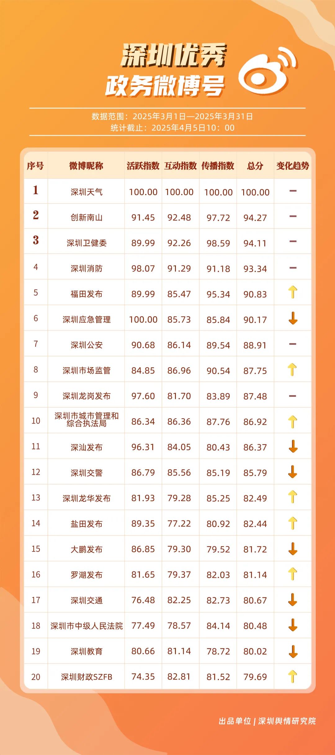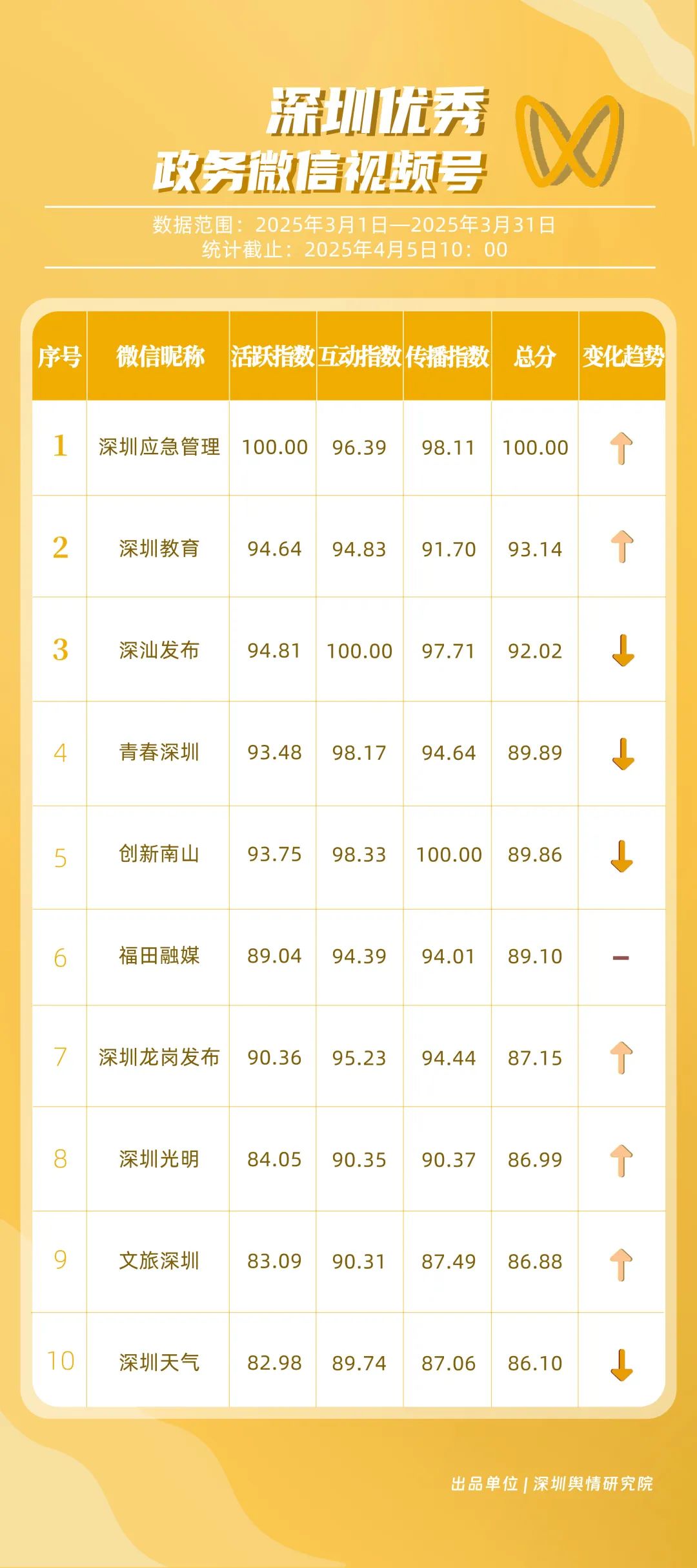 3月,市衛(wèi)生健康委、龍崗區(qū)、市氣象局、深汕特別合作區(qū)、南山區(qū)、福田區(qū)、市應急管理局、龍華區(qū)、寶安區(qū)、光明區(qū)榮登“深圳優(yōu)秀政務新媒體矩陣”榜單。3月,市衛(wèi)生健康委新媒體矩陣持續(xù)關注市民身心健康,發(fā)布健康科普內容,穩(wěn)居榜單第一位;龍崗區(qū)新媒體矩陣在抖音、微信視頻號平臺發(fā)力宣傳,躍居榜單第二位;市氣象局新媒體矩陣在微博平臺連續(xù)多期獲得滿分,持續(xù)以氣象預警與生活指南結合的內容模式,為市民帶來便利信息。以上賬號在“深圳優(yōu)秀政務新媒體矩陣”榜單中榮獲前三名。此外,深汕特別合作區(qū)新媒體矩陣積極發(fā)布網絡熱點內容,收獲較多網民關注分享;南山區(qū)新媒體矩陣多平臺實力強勁,以88.37分居于榜單第五位。值得關注的是,寶安區(qū)新媒體矩陣時隔多期躋身榜單前十名,多平臺均衡發(fā)展成效初顯。