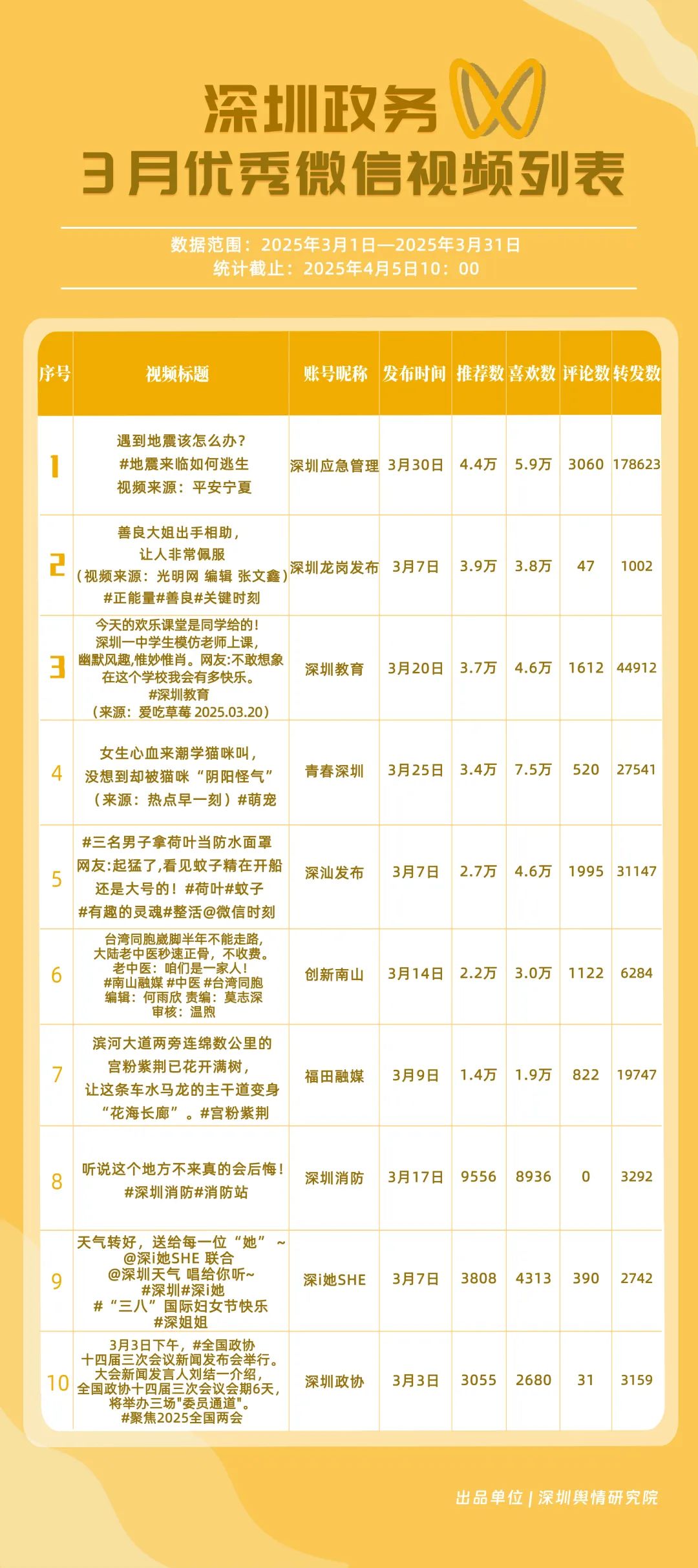 3月,獲“深圳優(yōu)秀政務微信視頻號”稱號的分別是“深圳應急管理”“深圳教育”“深汕發(fā)布”“青春深圳”“創(chuàng)新南山”“福田融媒”“深圳龍崗發(fā)布”“深圳光明”“文旅深圳”“深圳天氣”。其中,“深圳應急管理”以20余篇作品收獲超20萬次轉發(fā),躍居第一名,一期有關“地震來臨如何逃生”的視頻收獲超17萬次轉發(fā),展現(xiàn)了其內容的高實用性?!吧钲诮逃薄吧钌前l(fā)布”位于榜單第二、三位,總分超90分,反映出兩賬號在民生教育、區(qū)域宣傳領域擁有較好傳播效果。“青春深圳”“創(chuàng)新南山”“福田融媒”等賬號也在3月發(fā)布優(yōu)質視頻內容,展現(xiàn)了深圳政務新媒體在視頻號平臺宣傳的創(chuàng)新探索。