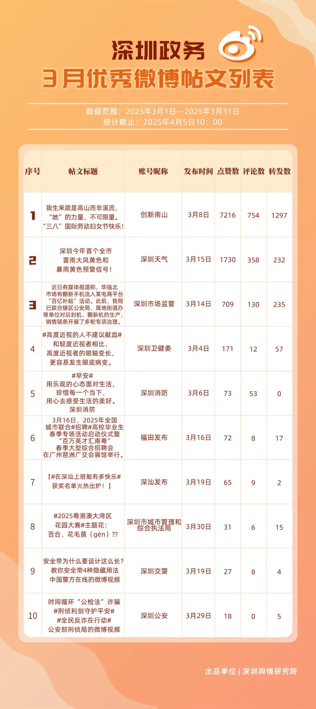 3月,“深圳天氣”“創(chuàng)新南山”“深圳衛(wèi)健委”“深圳消防”“福田發(fā)布”“深圳應急管理”“深圳公安”“深圳市場監(jiān)管”“深圳龍崗發(fā)布”“深圳市城市管理和綜合執(zhí)法局”等20個賬號入選“優(yōu)秀政務微博號”。值得一提的是,“深圳天氣”賬號在3月共獲得點贊超11萬,相較其他賬號具備顯著優(yōu)勢?!皠?chuàng)新南山”“深圳衛(wèi)健委”“深圳消防”也位列前茅,分差微小,競爭激烈。從領域分布來看,上榜賬號不僅包括區(qū)級賬號,還涵蓋民生服務、應急科普、城市治理等單位賬號,體現(xiàn)了深圳政務新媒體在多領域的強大影響力。