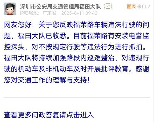 網(wǎng)友您好!關(guān)于您反映福榮路車輛違法行駛的問題,福田大隊(duì)已收悉。目前福榮路有安裝電警監(jiān)控探頭,對不按規(guī)定行駛等違法行為進(jìn)行抓拍。福田大隊(duì)將持續(xù)加強(qiáng)路段內(nèi)巡邏整治,對違規(guī)行駛的機(jī)動車及非機(jī)動車及時開展批評教育。感謝您對交通工作的理解與支持!