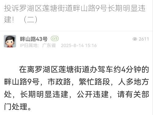 14. 帖文《投訴羅湖區(qū)蓮塘街道畔山路9號(hào)長(zhǎng)期明顯違建?。ǘ?/a>》