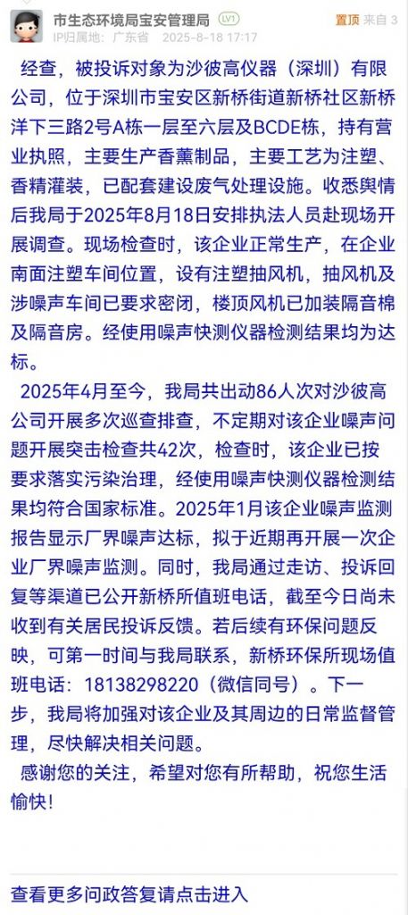 經(jīng)查,被投訴對(duì)象為沙彼高儀器(深圳)有限公司,位于深圳市寶安區(qū)新橋街道新橋社區(qū)新橋洋下三路2號(hào)A棟一層至六層及BCDE棟,持有營(yíng)業(yè)執(zhí)照,主要生產(chǎn)香薰制品,主要工藝為注塑、香精灌裝,已配套建設(shè)廢氣處理設(shè)施。收悉輿情后我局于2025年8月18日安排執(zhí)法人員赴現(xiàn)場(chǎng)開(kāi)展調(diào)查?,F(xiàn)場(chǎng)檢查時(shí),該企業(yè)正常生產(chǎn),在企業(yè)南面注塑車(chē)間位置,設(shè)有注塑抽風(fēng)機(jī),抽風(fēng)機(jī)及涉噪聲車(chē)間已要求密閉,樓頂風(fēng)機(jī)已加裝隔音棉及隔音房。經(jīng)使用噪聲快測(cè)儀器檢測(cè)結(jié)果均為達(dá)標(biāo)。
