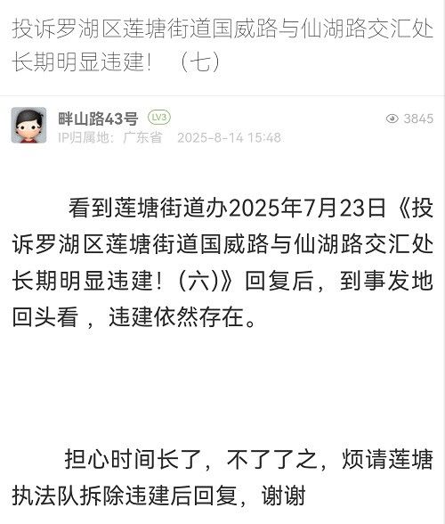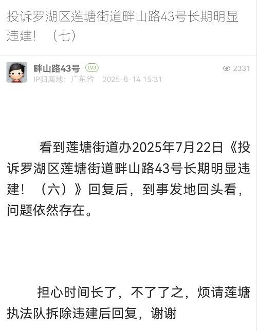 15. 帖文《投訴羅湖區(qū)蓮塘街道畔山路43號(hào)長(zhǎng)期明顯違建!(七)》