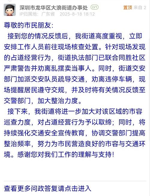 接下來(lái),我街道將進(jìn)一步加大對(duì)該區(qū)域的市容巡查力度,對(duì)占道經(jīng)營(yíng)行為予以取締;同時(shí),將持續(xù)強(qiáng)化交通安全宣傳教育,協(xié)調(diào)交警部門(mén)提高整治頻率,努力為市民營(yíng)造良好的市容與交通環(huán)境。感謝您對(duì)我們工作的理解與支持!