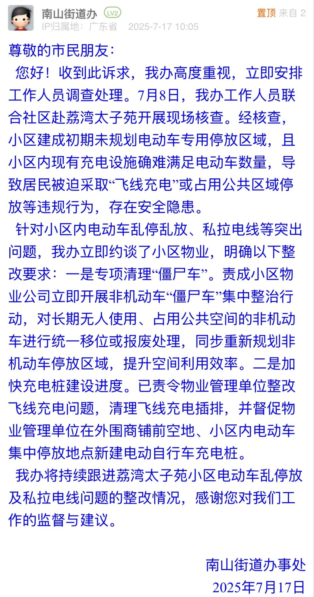 針對(duì)小區(qū)內(nèi)電動(dòng)車亂停放、私拉電線等存在安全隱患的行為,南山街道辦接訴后迅速聯(lián)合社區(qū)核查,說(shuō)明了歷史規(guī)劃不足的核心病因,通過(guò)約談物業(yè)推動(dòng)整改,從“應(yīng)急響應(yīng)”到“系統(tǒng)治理”的務(wù)實(shí)舉措,回應(yīng)了市民對(duì)消防通道暢通、用電安全的關(guān)切,以“標(biāo)本兼治”的治理思路,為老舊小區(qū)電動(dòng)車管理提供了可復(fù)制的解決方案。