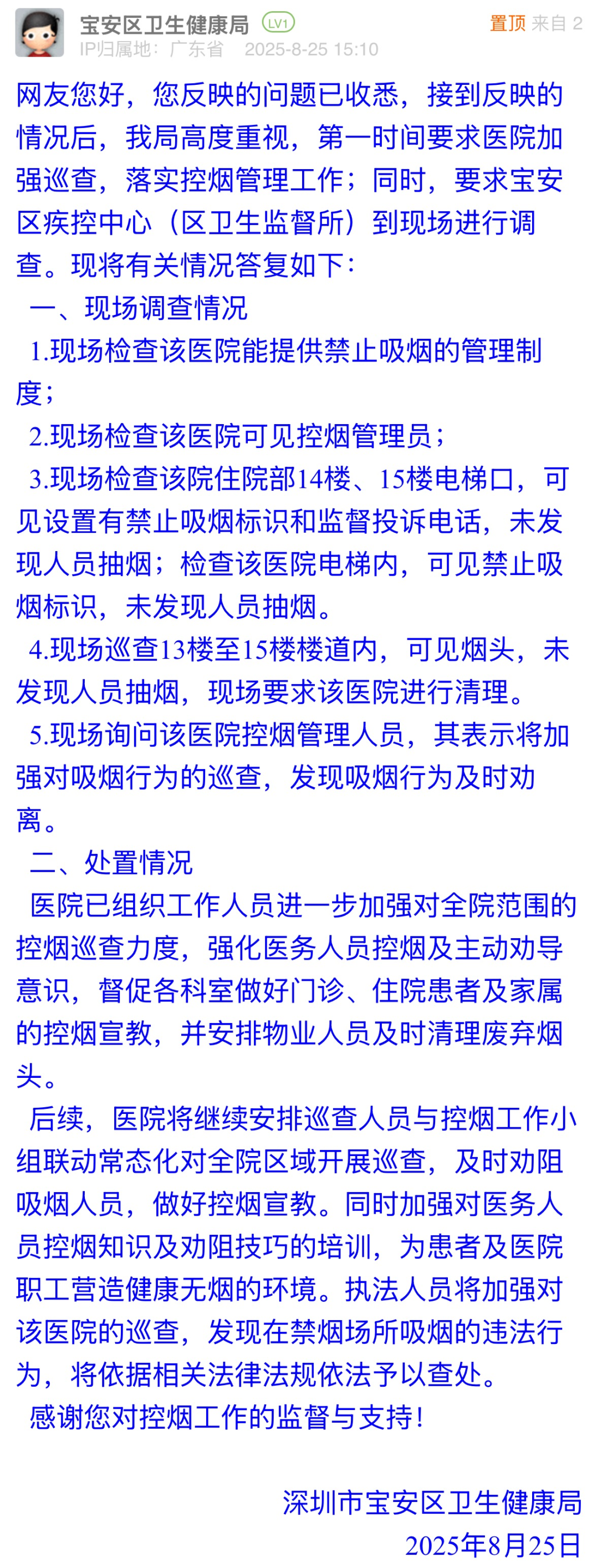優(yōu)化建議:接到市民反饋后,寶安區(qū)衛(wèi)生健康局快速組織現(xiàn)場(chǎng)調(diào)查,核實(shí)醫(yī)院有禁煙制度、控?zé)煿芾韱T在崗,基礎(chǔ)控?zé)煷胧┖瞬榈轿?,值得點(diǎn)贊。但回應(yīng)中多次強(qiáng)調(diào)“未發(fā)現(xiàn)人員抽煙”,回避對(duì)歷史吸煙行為處置、煙頭來(lái)源及勸阻機(jī)制失效的解釋?zhuān)c市民關(guān)切脫節(jié),難以消除市民對(duì)醫(yī)院日???zé)熌芰Φ膿?dān)憂(yōu),建議完善具體控?zé)煷胧?,如加裝煙感報(bào)警裝置,建立核查公示制度等,筑牢“無(wú)煙醫(yī)院”防線(xiàn)。
