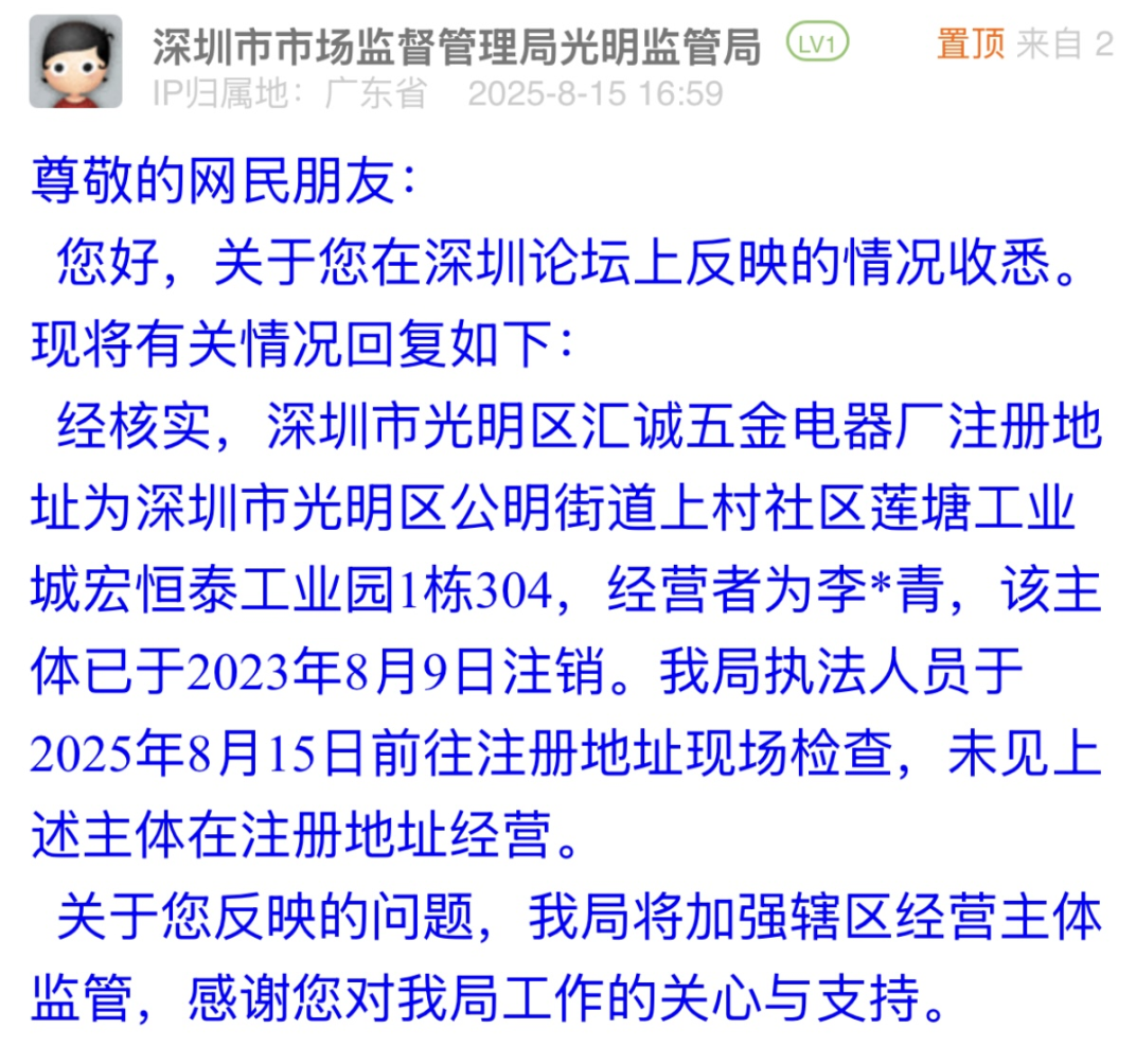 優(yōu)化建議:深圳市市場(chǎng)監(jiān)督管理局光明管理局的回應(yīng)中,核實(shí)了涉事電器廠(chǎng)已注銷(xiāo),且不在注冊(cè)地經(jīng)營(yíng),也提及加強(qiáng)轄區(qū)主體監(jiān)管,但市民反映的排插套用注銷(xiāo)主體信息銷(xiāo)售、違規(guī)標(biāo)識(shí)3C標(biāo)志等關(guān)鍵問(wèn)題,未得到明確解答。若回應(yīng)中能豐富指引類(lèi)內(nèi)容,如告知市民可向平臺(tái)追責(zé)的途徑、提交證據(jù)的具體方式,為市民維權(quán)提供清晰方向,將更貼合市民需求,也能讓回應(yīng)更具實(shí)際意義。
