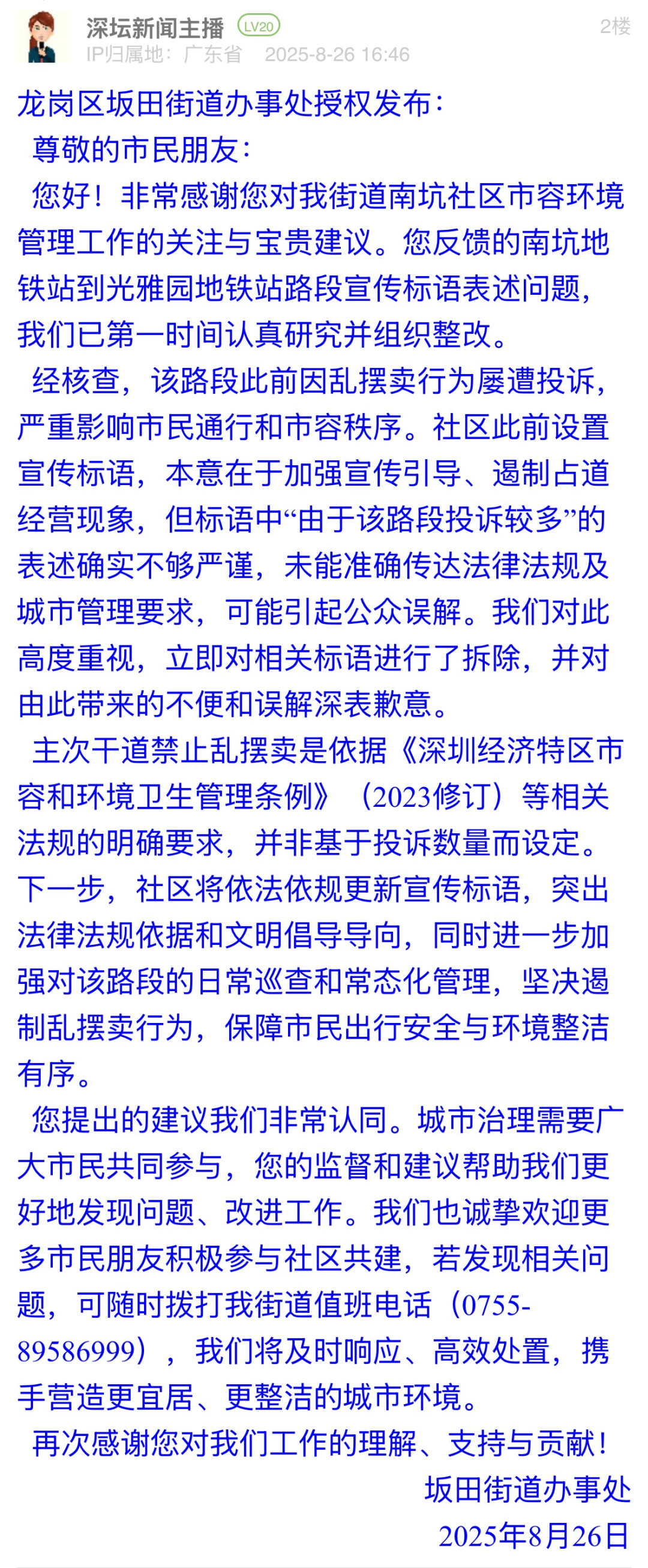 案例點(diǎn)評(píng):標(biāo)語(yǔ)表述不嚴(yán)謹(jǐn)可能引發(fā)公眾誤解,坂田街道辦展現(xiàn)出高效務(wù)實(shí)的態(tài)度,第一時(shí)間拆除涉事標(biāo)語(yǔ),計(jì)劃更新標(biāo)語(yǔ),明確標(biāo)語(yǔ)中提及的禁擺依據(jù)為法規(guī)要求而非投訴數(shù)量。回應(yīng)中,街道主動(dòng)致歉并公開(kāi)整改邏輯,展現(xiàn)“直面問(wèn)題不推諉”的擔(dān)當(dāng),更以“邀請(qǐng)市民參與共建”為切入點(diǎn),構(gòu)建“政府主導(dǎo)+公眾監(jiān)督”的治理閉環(huán)。此次整改有效化解因標(biāo)語(yǔ)表述不當(dāng)引發(fā)的公眾疑慮,彰顯了“以民為師”的共治智慧。