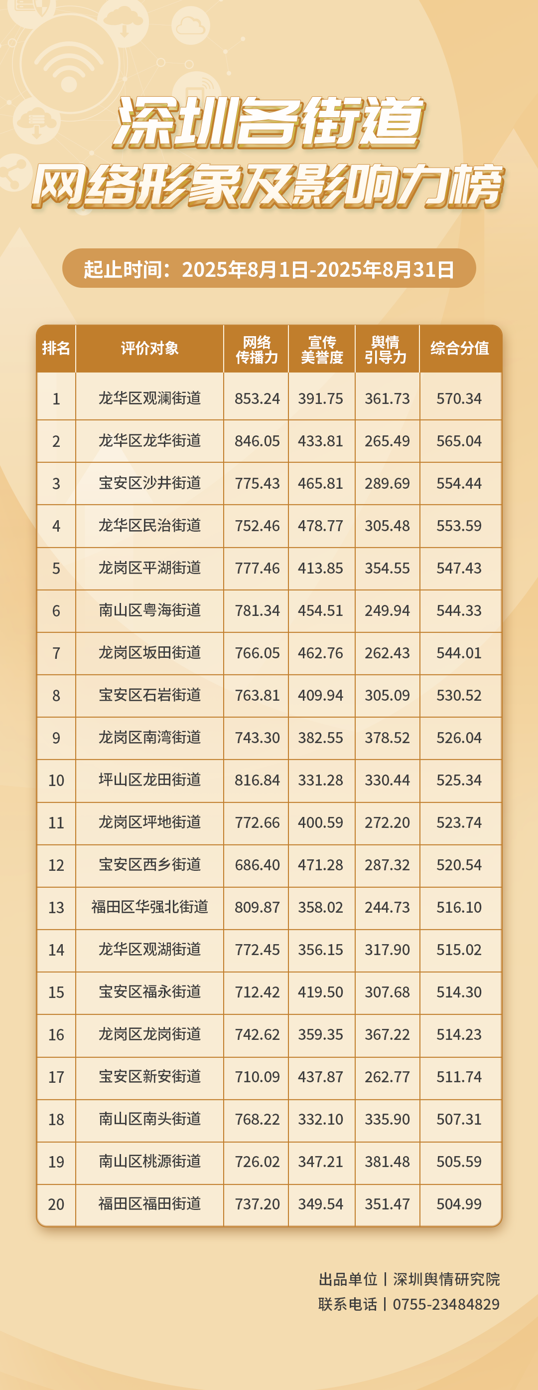 2025年8月,共有20個街道登上《深圳各街道網(wǎng)絡形象及影響力榜》,分別是:龍華區(qū)觀瀾街道、龍華區(qū)龍華街道、寶安區(qū)沙井街道、龍華區(qū)民治街道、龍崗區(qū)平湖街道、南山區(qū)粵海街道、龍崗區(qū)坂田街道、寶安區(qū)石巖街道、龍崗區(qū)南灣街道、坪山區(qū)龍?zhí)锝值?、龍崗區(qū)坪地街道、寶安區(qū)西鄉(xiāng)街道、福田區(qū)華強北街道、龍華區(qū)觀湖街道、寶安區(qū)福永街道、龍崗區(qū)龍崗街道、寶安區(qū)新安街道、南山區(qū)南頭街道、南山區(qū)桃源街道、福田區(qū)福田街道。