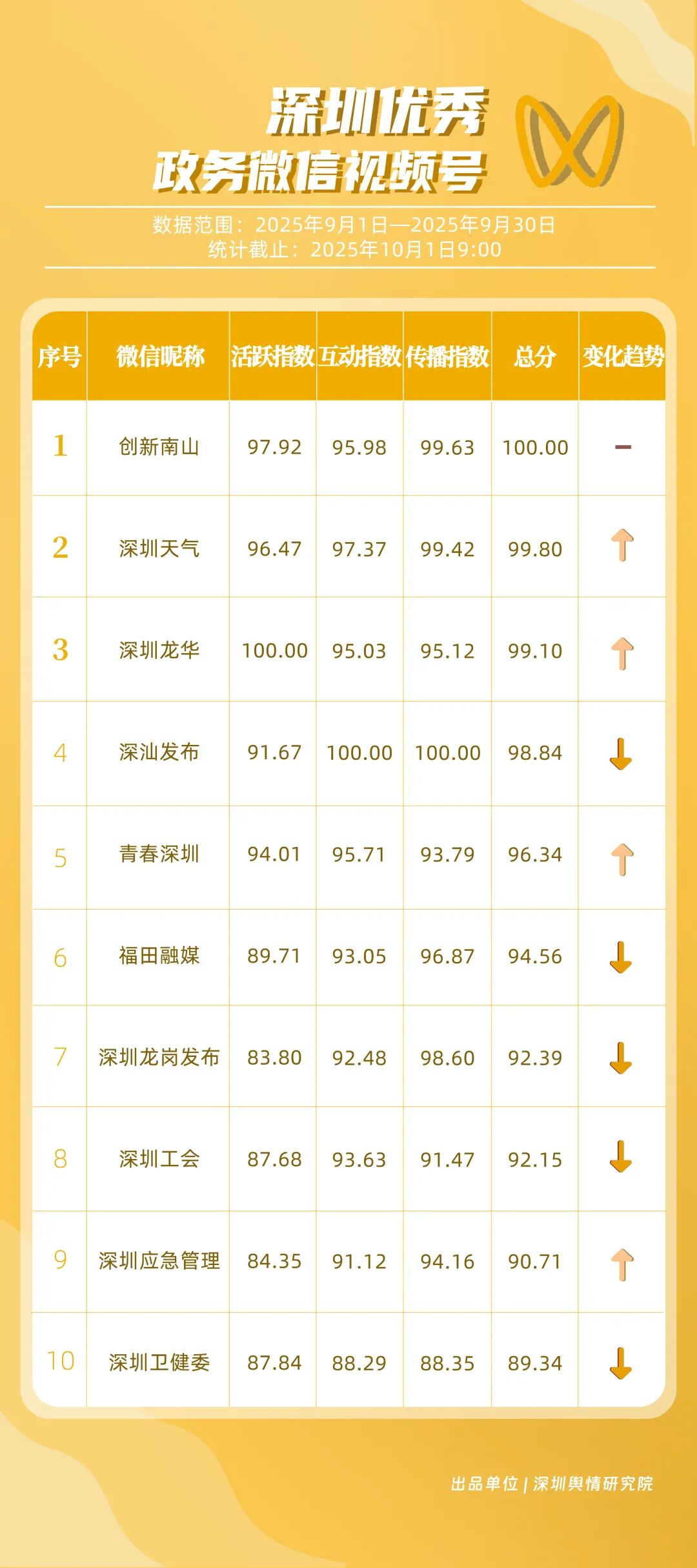 9月,深圳政務(wù)新媒體矩陣持續(xù)優(yōu)化內(nèi)容生態(tài),各單位依托平臺(tái)特色深化服務(wù)效能,南山區(qū)、市衛(wèi)生健康委員會(huì)、市氣象局(臺(tái))、龍崗區(qū)、福田區(qū)、龍華區(qū)、深汕特別合作區(qū)、市應(yīng)急管理局、中國共產(chǎn)主義青年團(tuán)深圳市委員會(huì)、光明區(qū)的新媒體矩陣入選“深圳優(yōu)秀政務(wù)新媒體矩陣”榜單。9月,南山區(qū)在短視頻平臺(tái)表現(xiàn)突出,抖音、微信視頻號(hào)平臺(tái)均獲滿分;市衛(wèi)生健康委員會(huì)輸出深度內(nèi)容,位列榜單第二;市氣象局(臺(tái))新媒體矩陣居于榜單第三,在9月發(fā)布臺(tái)風(fēng)相關(guān)天氣提醒,獲得公眾廣泛關(guān)注。此外,龍崗區(qū)、福田區(qū)、龍華區(qū)、深汕特別合作區(qū)新媒體矩陣持續(xù)推出優(yōu)質(zhì)內(nèi)容,共同展現(xiàn)了深圳在塑造現(xiàn)代化形象、提升數(shù)字治理能力上的創(chuàng)新引領(lǐng)作用。