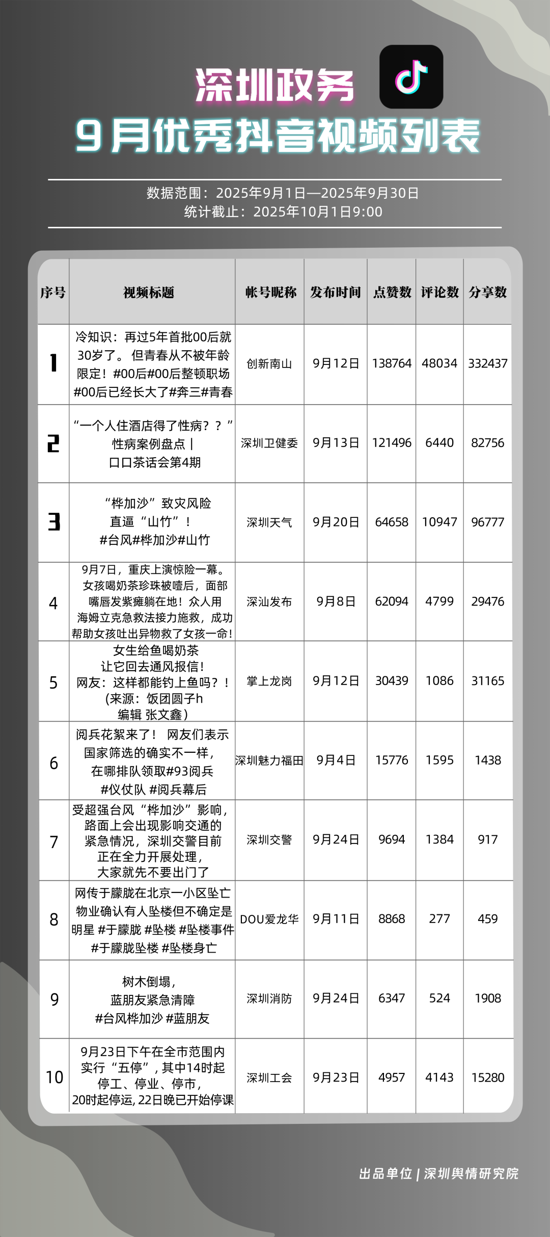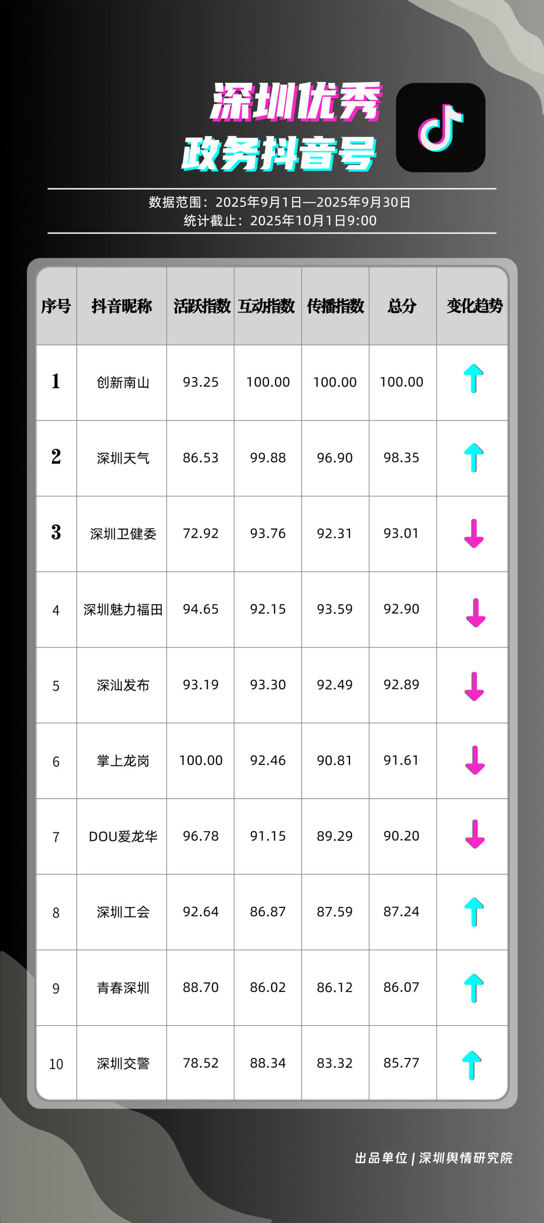 9月,獲得“優(yōu)秀政務(wù)抖音號(hào)”稱號(hào)的是“創(chuàng)新南山”“深圳天氣”“深圳衛(wèi)健委”“深圳魅力福田”“深汕發(fā)布”“掌上龍崗”“DOU愛龍華”“深圳工會(huì)”“青春深圳”“深圳交警”?!皠?chuàng)新南山”以一條有關(guān)“青春不被年齡限定”的視頻獲得超34萬次轉(zhuǎn)發(fā),超14萬次點(diǎn)贊,助力其在抖音榜單居于榜首;“深圳天氣”多條臺(tái)風(fēng)相關(guān)視頻吸引大量網(wǎng)民關(guān)注、互動(dòng),在抖音平臺(tái)得分超98分;“深圳衛(wèi)健委”“深圳魅力福田”“深汕發(fā)布”等賬號(hào)緊隨其后,得分均在92分以上。上榜的優(yōu)秀政務(wù)抖音號(hào)以“有溫度”的敘事表達(dá),將宣傳、服務(wù)內(nèi)容轉(zhuǎn)化為網(wǎng)民喜聞樂見的視頻,收獲高點(diǎn)贊、高轉(zhuǎn)發(fā)的流量實(shí)績,更在評(píng)論區(qū)形成了良性互動(dòng)生態(tài),深度運(yùn)營收獲了較好成果。