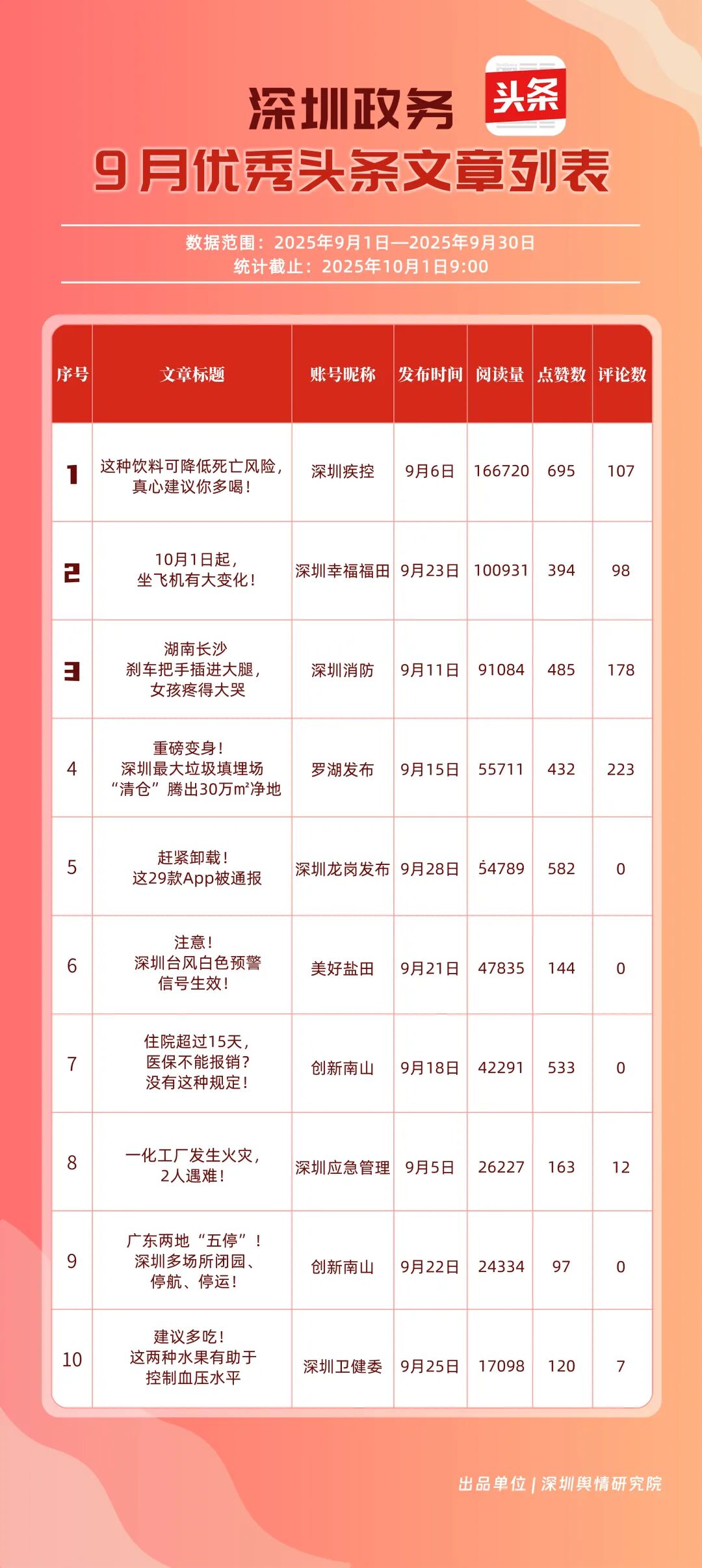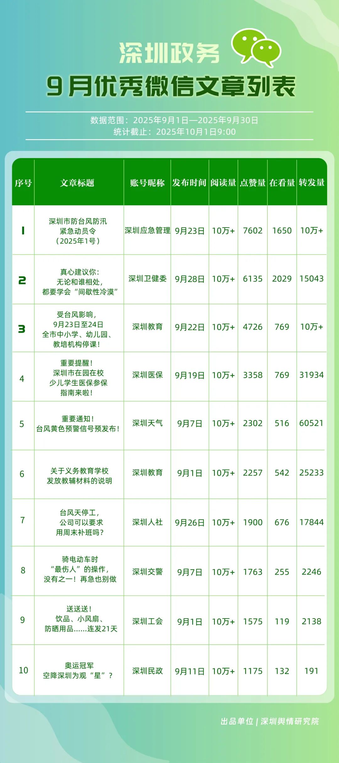 9月,“深圳幸福福田”“深圳疾控”“深圳消防”“羅湖發(fā)布”“深圳龍崗發(fā)布”“創(chuàng)新南山”“深圳龍華”“青春深圳”“深圳人社”“濱海寶安”共10個(gè)政務(wù)頭條號(hào)入選“優(yōu)秀政務(wù)頭條號(hào)”榜單?!吧钲谛腋8L铩狈€(wěn)居榜單首位,在傳播、互動(dòng)等方面均表現(xiàn)卓越;“深圳疾控”關(guān)注民生健康,有關(guān)“喝茶的好處”“非正規(guī)醫(yī)美針風(fēng)險(xiǎn)”兩篇文章閱讀均超10萬次,為市民提供健康信息;“深圳消防”聚焦消防安全領(lǐng)域,提醒市民注意安全。相關(guān)上榜賬號(hào)表現(xiàn)優(yōu)異,注重內(nèi)容實(shí)用化、互動(dòng)場景化,彰顯了政務(wù)新媒體的服務(wù)效能。