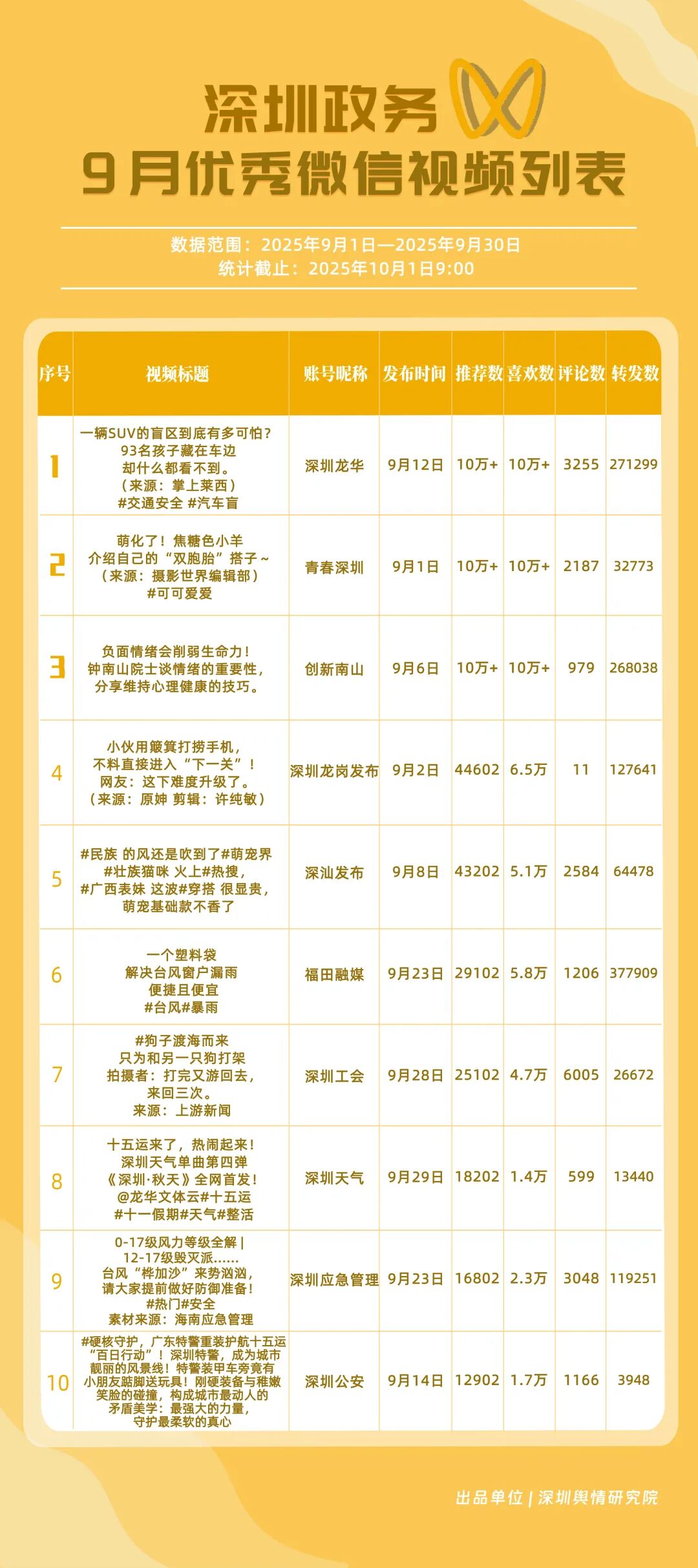 2025年9月期《深圳優(yōu)秀政務(wù)新媒體矩陣》正式發(fā)布,上榜矩陣以精準(zhǔn)高效的傳播策略與前瞻性的創(chuàng)新實(shí)踐脫穎而出,不僅為政務(wù)信息傳播樹立了行業(yè)典范,更通過多元內(nèi)容,持續(xù)探索政務(wù)服務(wù)與公眾溝通的新路徑,為深圳政務(wù)新媒體高質(zhì)量發(fā)展注入智慧與力量。
