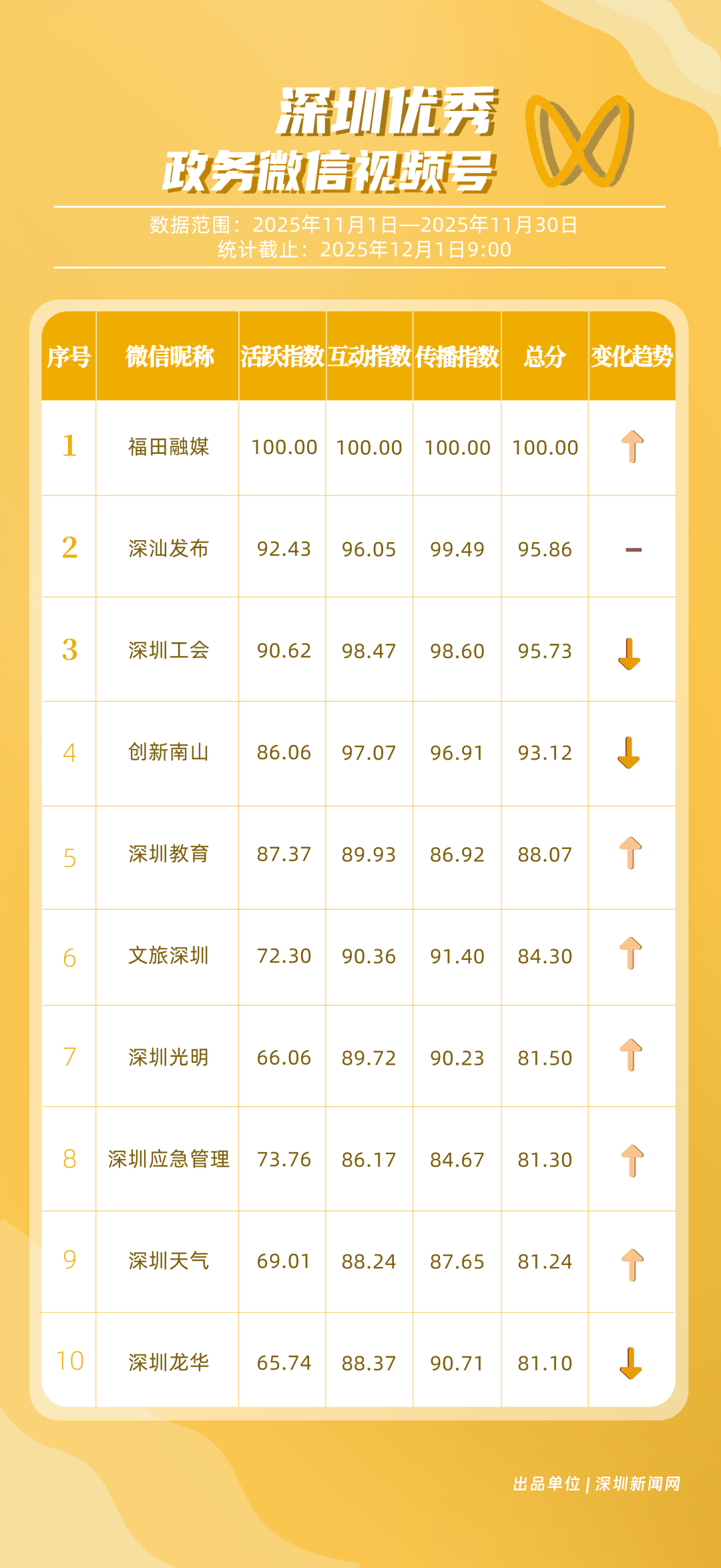 《深圳優(yōu)秀政務(wù)新媒體矩陣》將深圳黨政機(jī)關(guān)、企事業(yè)單位開設(shè)的政務(wù)公眾號(微信)、微博號、抖音號、視頻號(微信)及頭條號按照活躍指數(shù)、互動指數(shù)、傳播指數(shù)三項指標(biāo)進(jìn)行綜合評價,最終形成優(yōu)秀名單。