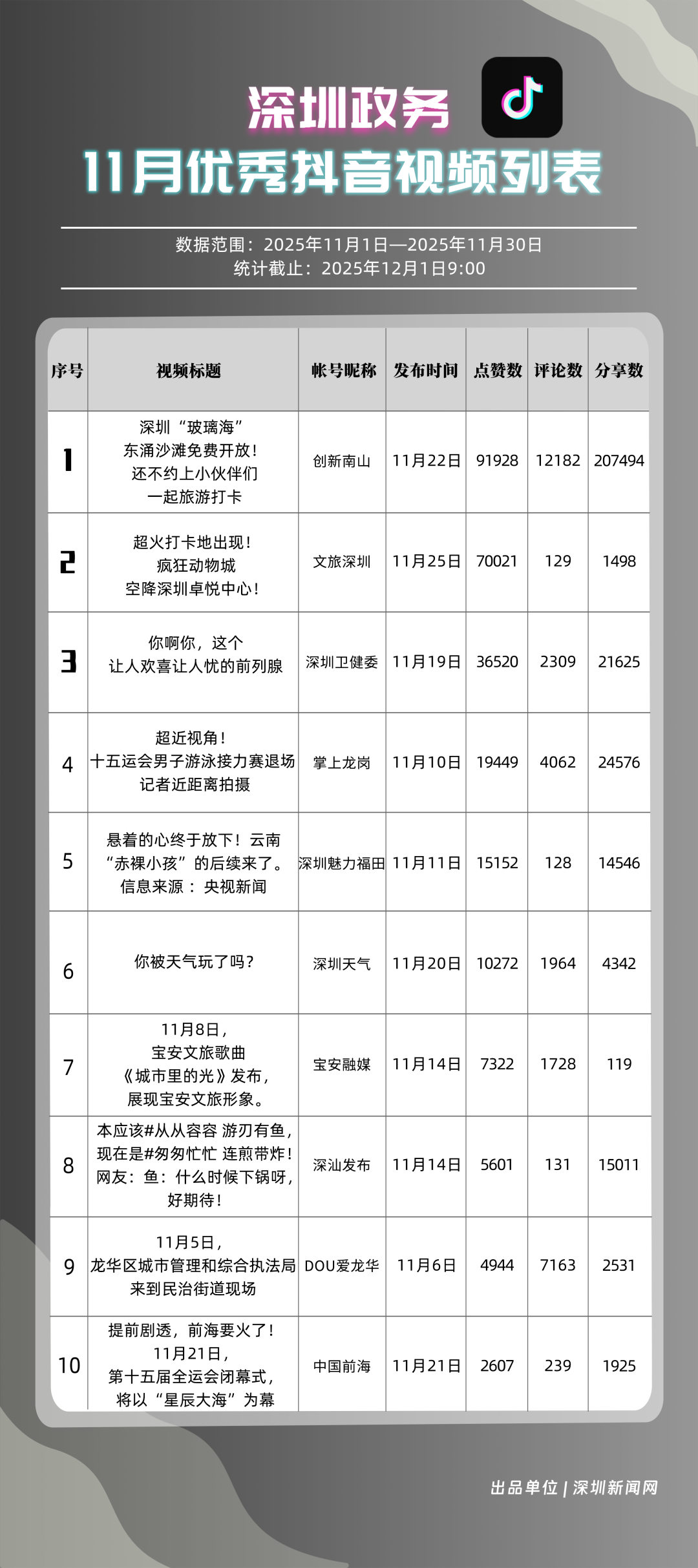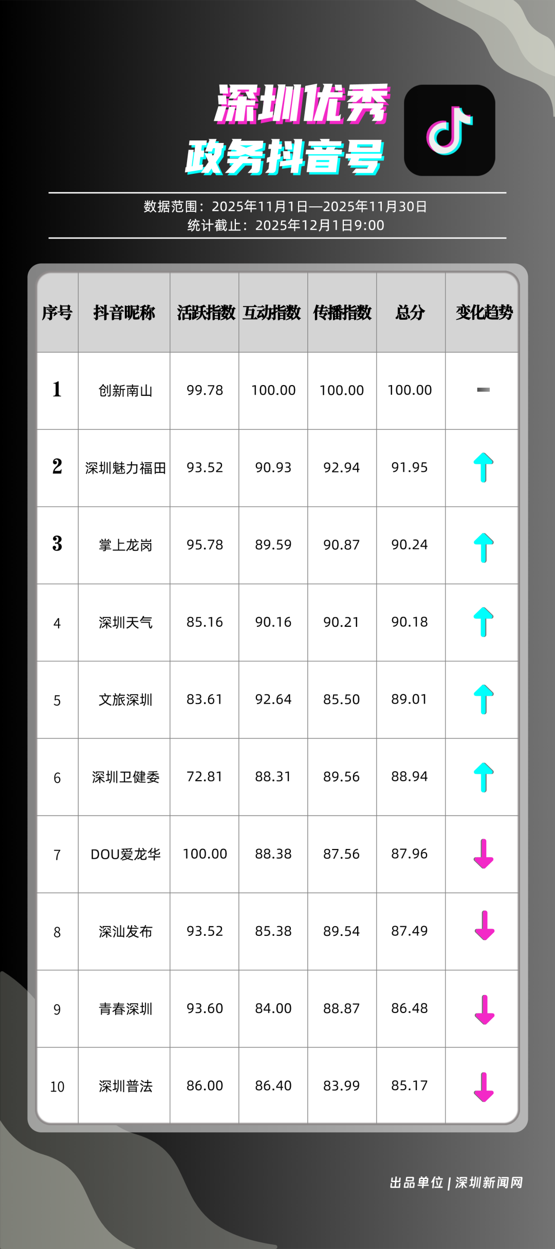 11月,獲得“優(yōu)秀政務(wù)抖音號”稱號的是“創(chuàng)新南山”“深圳魅力福田”“掌上龍崗”“深圳天氣”“文旅深圳”“深圳衛(wèi)健委”“DOU愛龍華”“深汕發(fā)布”“青春深圳”“深圳普法”?!皠?chuàng)新南山”多篇文旅、健康及出行相關(guān)內(nèi)容分享超10萬次,在互動、傳播方面表現(xiàn)亮眼,蟬聯(lián)榜首;“深圳魅力福田”在各方面指數(shù)評分較為均衡,位列第二名;“掌上龍崗”在活躍指數(shù)得分較高,能夠較好均衡內(nèi)容數(shù)量與質(zhì)量,位居第三,排名較上期有所提高。“深圳天氣”“文旅深圳”等賬號緊隨其后,得分均在90分上下。上榜優(yōu)秀政務(wù)抖音號通過深耕內(nèi)容創(chuàng)作,收獲了高點(diǎn)贊、高分享的傳播效果,也推動評論區(qū)形成正向互動生態(tài),最終以優(yōu)質(zhì)內(nèi)容為核心載體,增強(qiáng)政務(wù)賬號影響力。