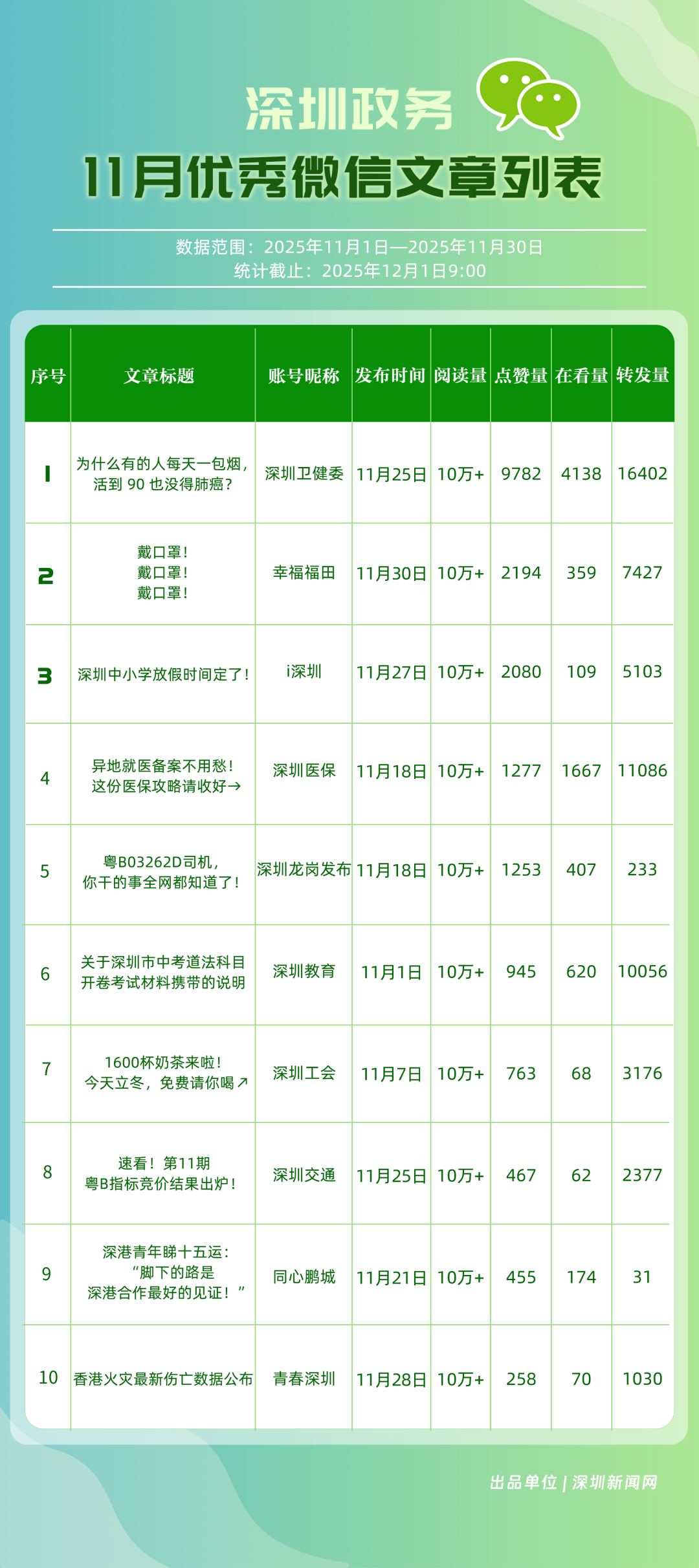 11月,“深圳衛(wèi)健委”“深圳龍崗發(fā)布”“幸福福田”“i深圳”“青春深圳”“深圳工會”“深圳光明”“創(chuàng)新南山”“深圳教育”“深圳龍華”等30個政務(wù)微信公眾號榮登“深圳優(yōu)秀政務(wù)微信公眾號”榜單。11月,“深圳衛(wèi)健委”在活躍、互動、傳播方面均取得較好成效,以滿分位于榜單首位;“深圳龍崗發(fā)布”在傳播、互動指數(shù)得分較高,十余篇文章閱讀量超10萬次,位居榜單第二;“幸福福田”持續(xù)發(fā)布優(yōu)秀內(nèi)容,排名第三。“i深圳”“青春深圳”“深圳工會”等政務(wù)賬號在信息發(fā)布中拓展信息維度、深化服務(wù)場景,評分在88分以上。上榜微信公眾號以高質(zhì)量內(nèi)容為核心抓手,在政務(wù)傳播賽道樹立了標(biāo)桿形象,成為兼具影響力與公信力的典范。