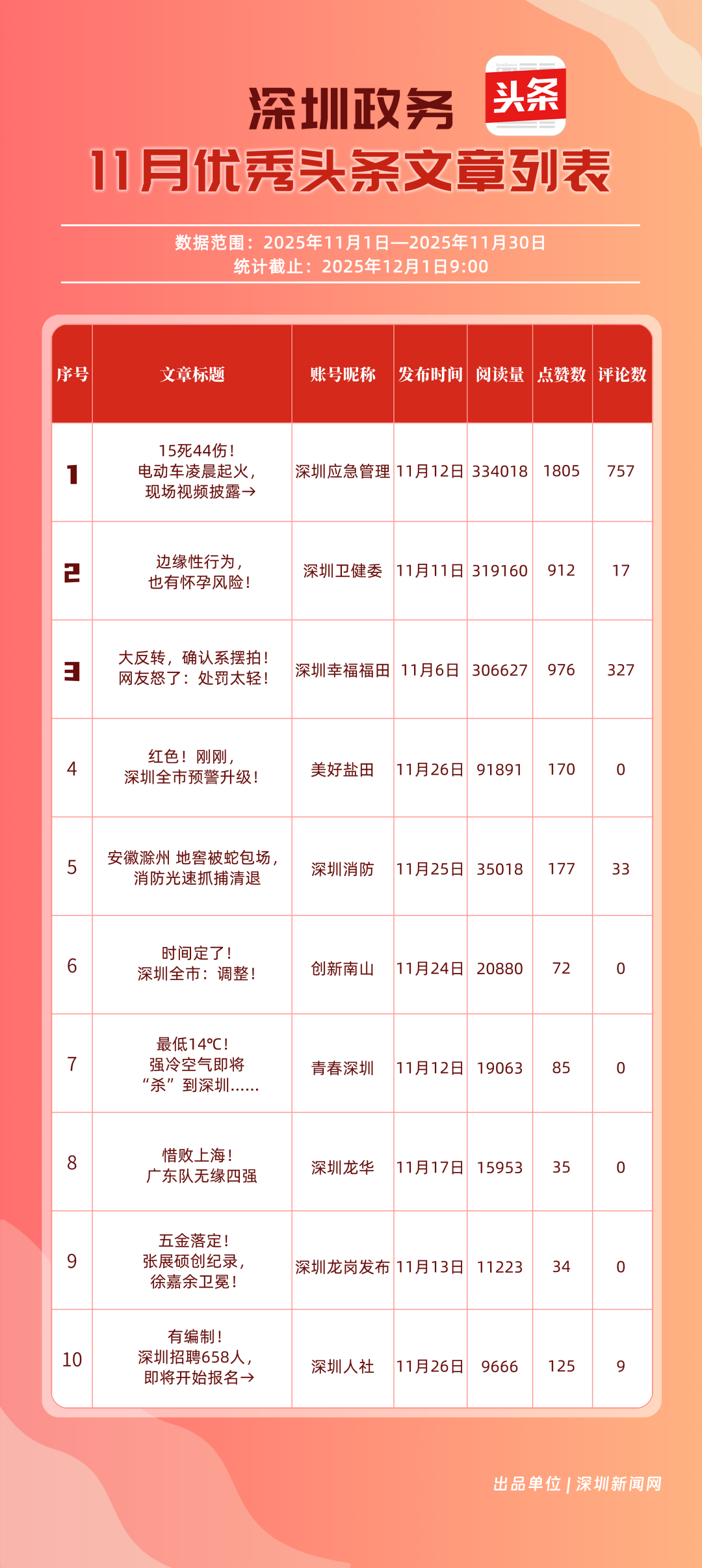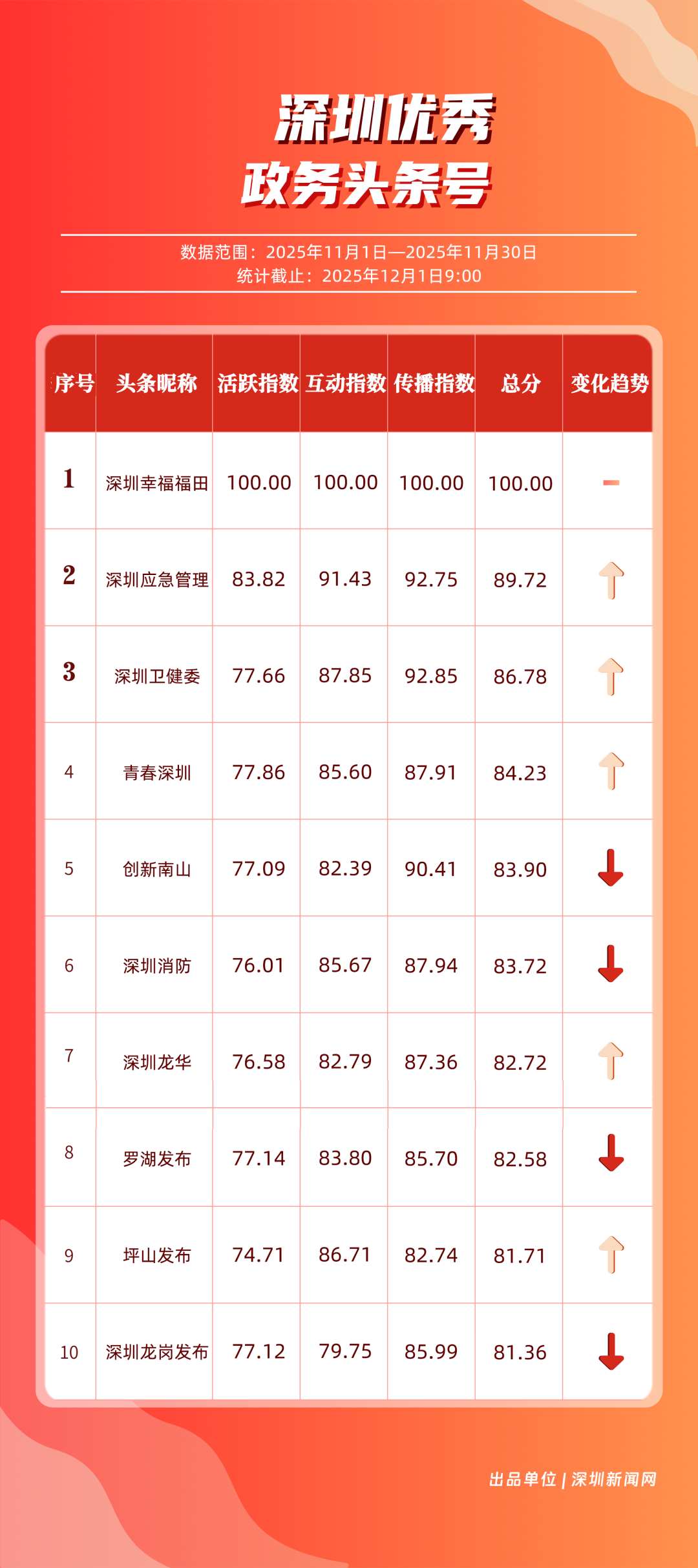 11月,“深圳幸福福田”“深圳應(yīng)急管理”“深圳衛(wèi)健委”“青春深圳”“創(chuàng)新南山”“深圳消防”“深圳龍華”“羅湖發(fā)布”“坪山發(fā)布”“深圳龍崗發(fā)布”共10個政務(wù)頭條號入選“優(yōu)秀政務(wù)頭條號”榜單?!吧钲谛腋8L铩卑l(fā)揮穩(wěn)定,以滿分成績蟬聯(lián)榜首,彰顯出強(qiáng)大的政務(wù)傳播力與影響力;“深圳應(yīng)急管理”積極發(fā)布應(yīng)急、安全類內(nèi)容,位居第二;“深圳衛(wèi)健委”則以優(yōu)質(zhì)健康類信息吸引市民關(guān)注,排名上升至第3位?!扒啻荷钲凇薄皠?chuàng)新南山”“深圳消防”得分在83分以上。相關(guān)上榜賬號以內(nèi)容創(chuàng)新為紐帶,聚焦民生,為城市治理現(xiàn)代化與民生服務(wù)精細(xì)化注入了鮮活力量。