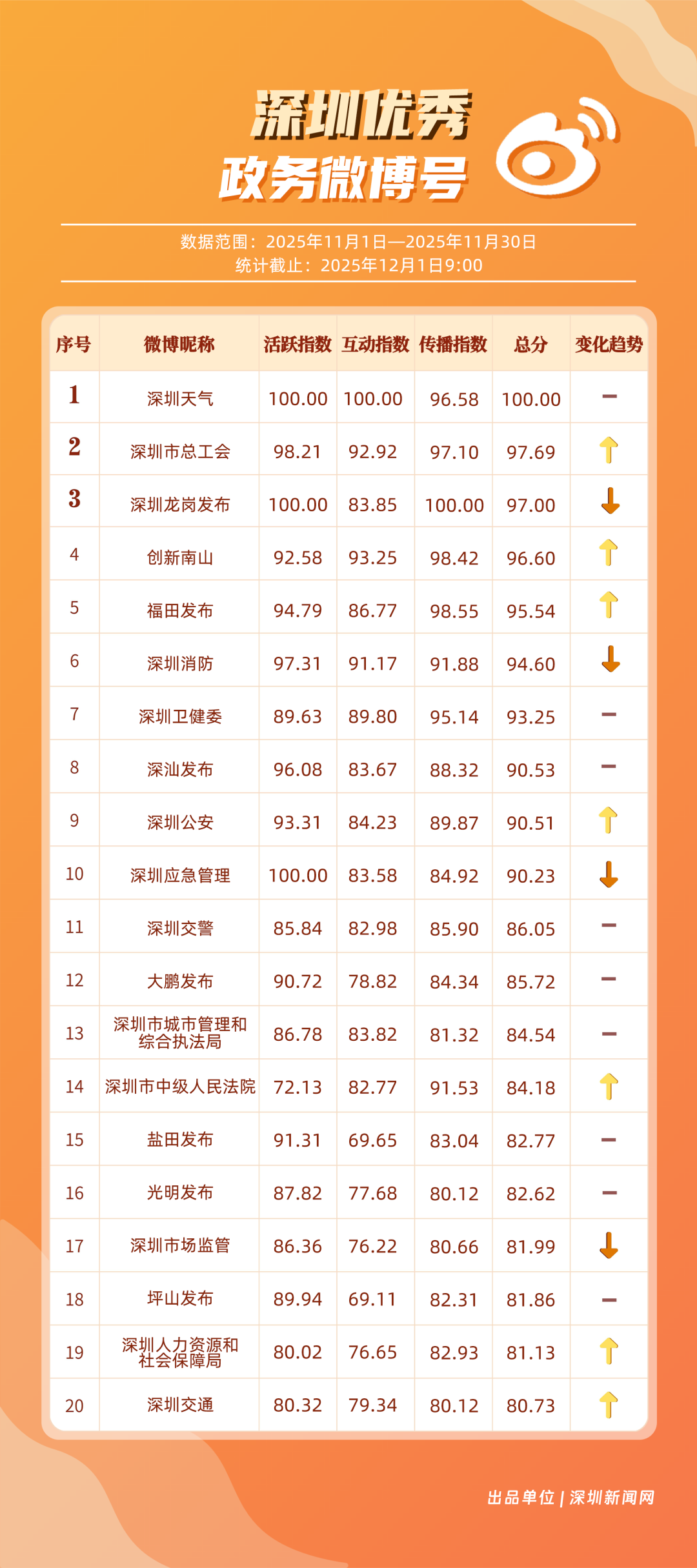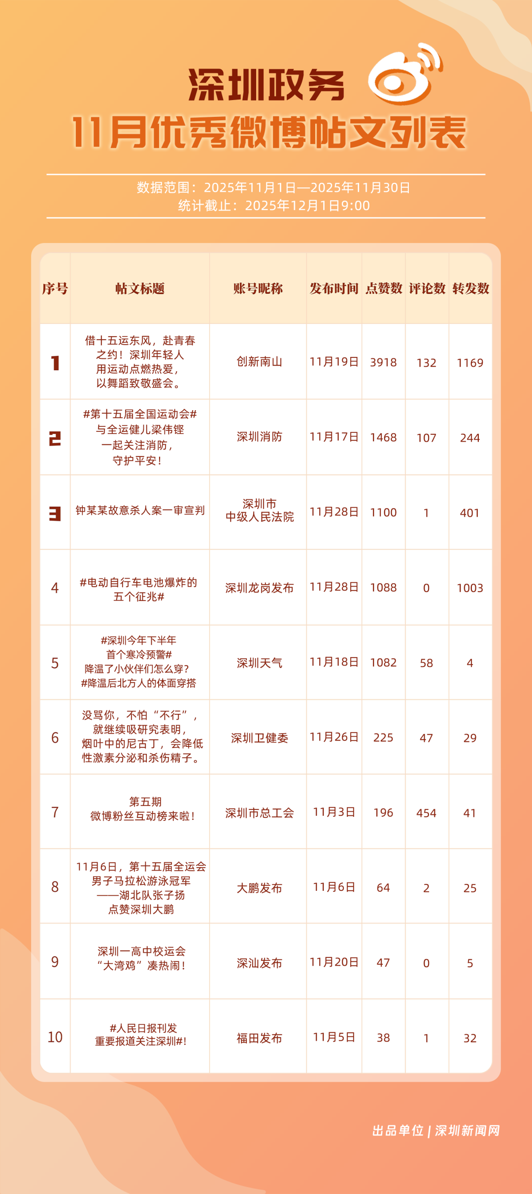 11月,20個賬號入選“優(yōu)秀政務(wù)微博號”榜單,其中包括:“深圳天氣”“深圳市總工會”“深圳龍崗發(fā)布”“創(chuàng)新南山”“福田發(fā)布”“深圳消防”“深圳衛(wèi)健委”“深汕發(fā)布”“深圳公安”“深圳應(yīng)急管理”等。其中,“深圳天氣”高頻次發(fā)布天氣類信息,受到網(wǎng)民肯定,蟬聯(lián)榜首;“深圳市總工會”發(fā)布互動抽獎、十五運(yùn)等多元內(nèi)容,排名提升至第二;“深圳龍崗發(fā)布”在傳播指數(shù)獲得較高得分,助力其位列第三。上榜優(yōu)秀政務(wù)微博賬號以優(yōu)秀內(nèi)容提升賬號競爭力,贏得公眾認(rèn)可,實(shí)現(xiàn)了政務(wù)信息的有效傳播,為政務(wù)新媒體的內(nèi)容運(yùn)營與價值傳遞提供參考。