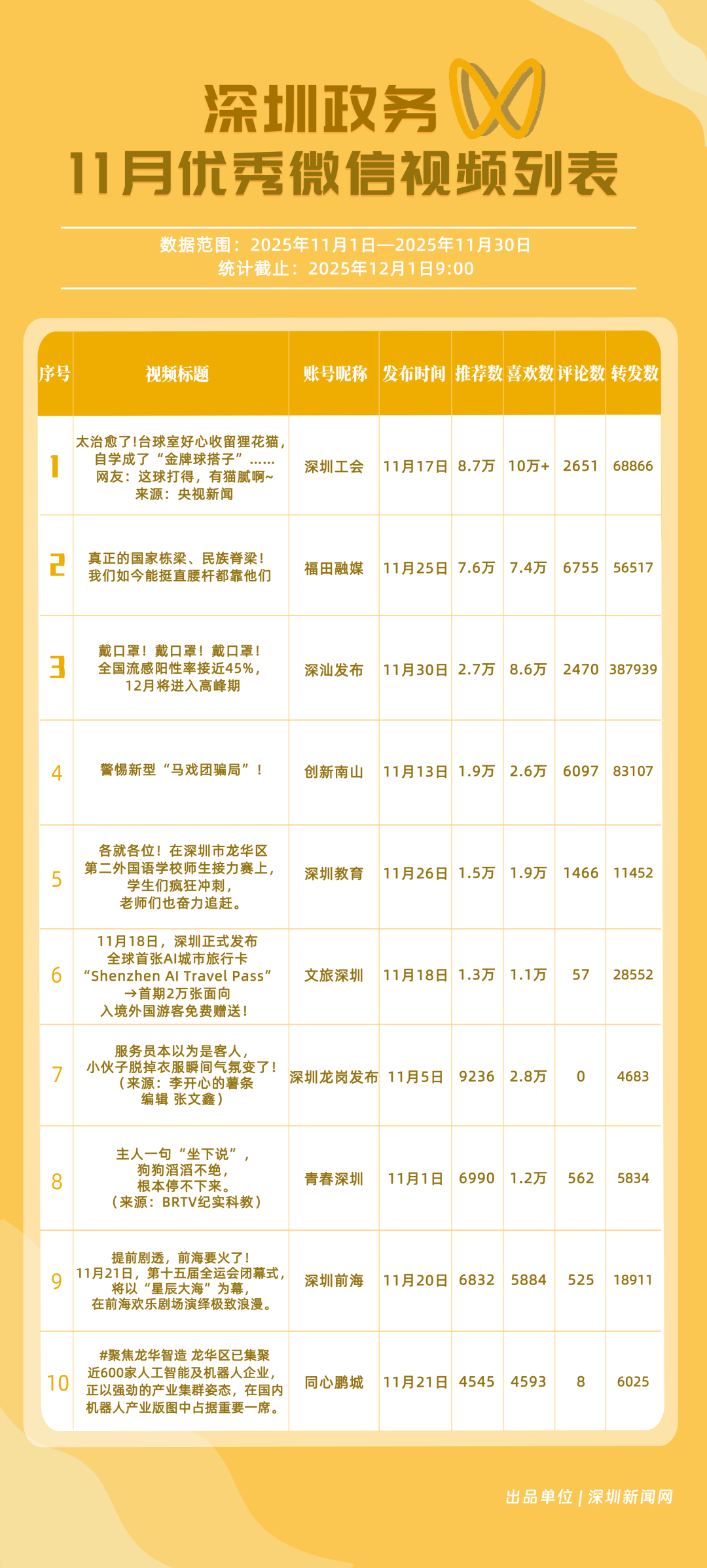 11月,“福田融媒”“深汕發(fā)布”“深圳工會”“創(chuàng)新南山”“深圳教育”“文旅深圳”“深圳光明”“深圳應(yīng)急管理”“深圳天氣”“深圳龍華”榮獲“優(yōu)秀政務(wù)微信視頻號”稱號。“福田融媒”月總轉(zhuǎn)發(fā)量超60萬次,各方面發(fā)揮穩(wěn)定,位居榜單第一;“深汕發(fā)布”一條“流感陽性”視頻提醒市民關(guān)注健康信息,單條視頻轉(zhuǎn)發(fā)超30萬次,助推其位列榜單第二名;“深圳工會”積極轉(zhuǎn)載網(wǎng)絡(luò)熱門信息,內(nèi)容多元,位列榜單第三名?!皠?chuàng)新南山”“深圳教育”等賬號緊隨其后。上榜微信視頻號以輕量化短視頻為載體,將政務(wù)信息轉(zhuǎn)化為公眾喜聞樂見的內(nèi)容形式,最終打造出兼具傳播力與親和力的政務(wù)宣傳新名片。