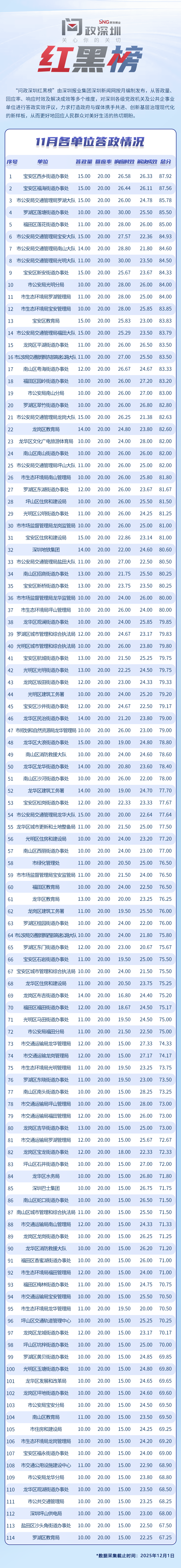 “問政深圳紅黑榜”具有科學(xué)、合理、完備的綜合評(píng)價(jià)體系,能夠綜合評(píng)估深圳各級(jí)黨政機(jī)關(guān)和公共企事業(yè)單位的答政情況。
