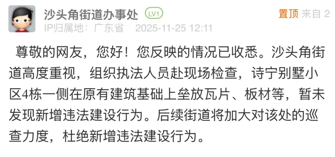 優(yōu)化建議:針對(duì)網(wǎng)民投訴的小區(qū)違建問題,街道回應(yīng)僅以“未發(fā)現(xiàn)新增違法建設(shè)行為”簡(jiǎn)單回復(fù),尚有完善空間。若該點(diǎn)位存在建設(shè)年代久遠(yuǎn)、權(quán)屬界定模糊、涉及多主體協(xié)調(diào)等客觀難點(diǎn),可適度說(shuō)明,并在回應(yīng)中補(bǔ)充核查細(xì)節(jié),說(shuō)明后續(xù)處置方向與階段計(jì)劃,讓回應(yīng)更具可信度和實(shí)操性,回應(yīng)市民對(duì)“依法履職”的期待。