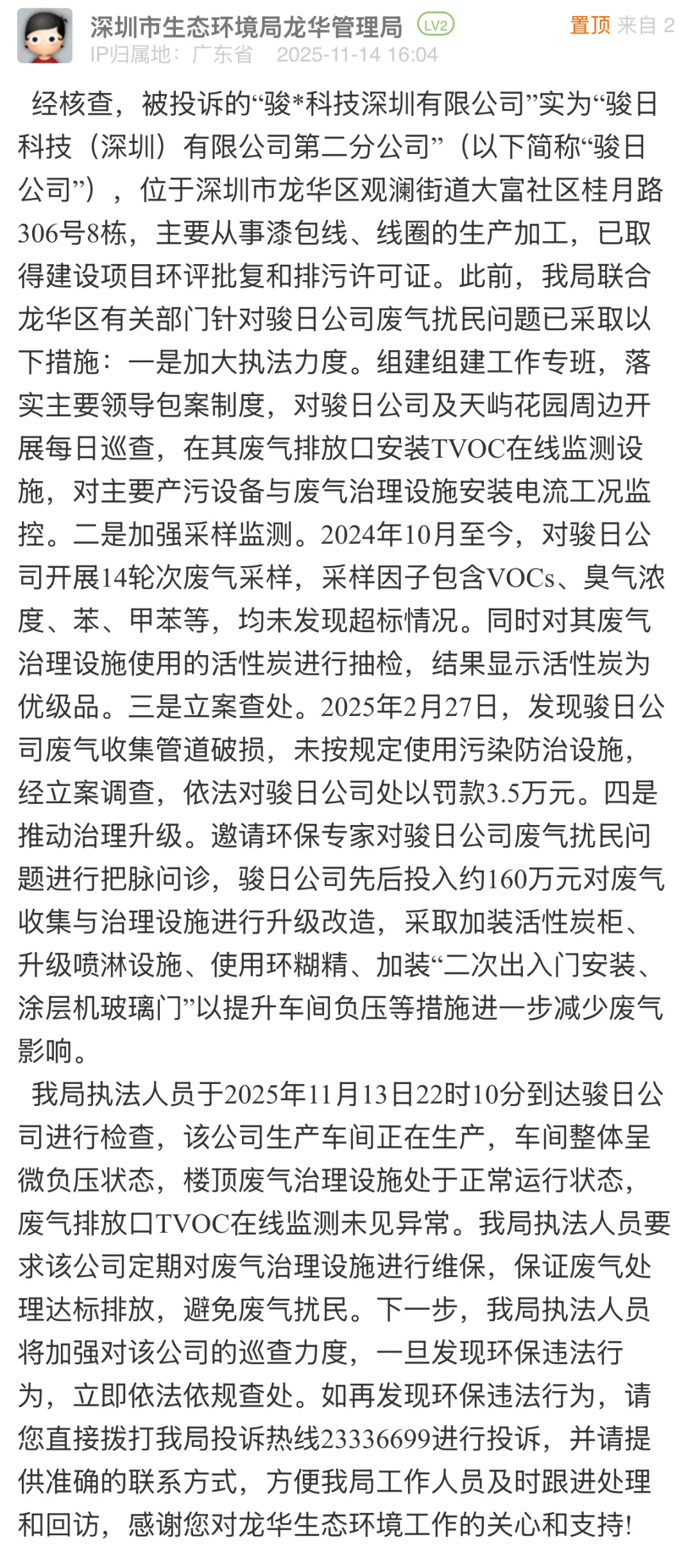 優(yōu)化建議:針對(duì)市民反映的工業(yè)廢氣擾民問題,相關(guān)部門雖采取巡查監(jiān)測(cè)、立案查處、推動(dòng)設(shè)備升級(jí)等舉措,但未能實(shí)質(zhì)性化解居民困擾。在該問政網(wǎng)帖的評(píng)論區(qū),有多位業(yè)主留言反映,近一年來(lái)“天天聞到臭氣”,并對(duì)“采樣均未發(fā)現(xiàn)超標(biāo)情況”的回復(fù)表示質(zhì)疑。建議相關(guān)部門在依托專業(yè)設(shè)備檢測(cè)的同時(shí),結(jié)合居民“嗅辨”反饋開展精準(zhǔn)溯源,切實(shí)回應(yīng)群眾對(duì)清新環(huán)境的基本訴求,推動(dòng)治理從“數(shù)據(jù)達(dá)標(biāo)”轉(zhuǎn)向“群眾滿意”。